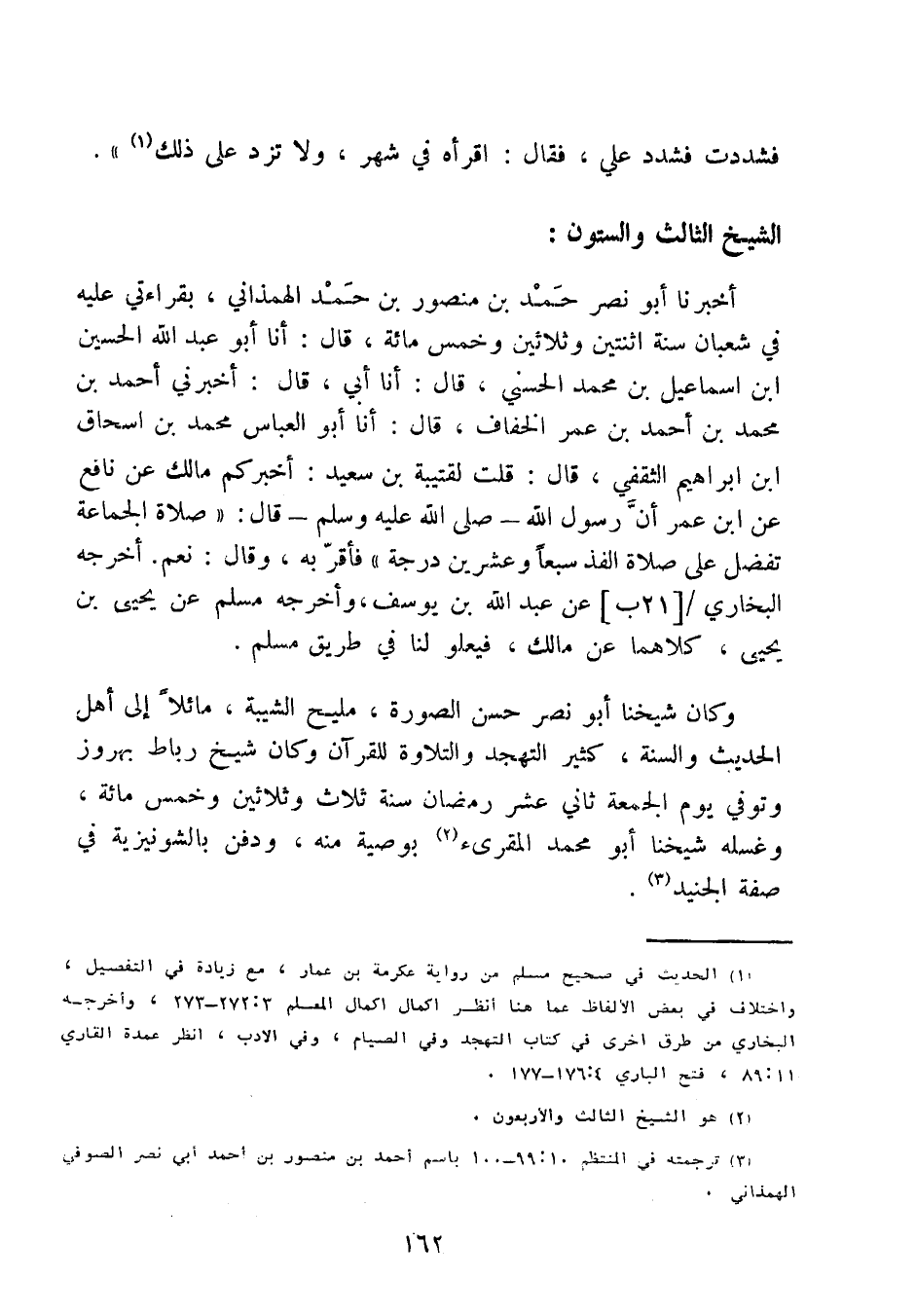 أَخْبَرَنَا أَبُو نَصْرٍ حَمَدُ بْنُ مَنْصُورِ بْنِ حَمَدِ الْهَمَذَانِيُّ، بِقِرَاءَتِي عَلَيْهِ فِي شَعْبَانَ سَنَةِ اثْنَتَيْنِ وَثَلاثِينَ وَخَمْسِ مِائَةٍ، قَالَ: أنا أَبُو عَبْدِ اللَّهِ الْحُسَيْنُ بْنُ إِسْمَاعِيلَ بْنِ مُحَمَّدٍ الْحَسَنِيُّ، قَالَ: أنا أَبِي، قَالَ: أَخْبَرَنِي أَحْمَدُ بْنُ مُحَمَّدِ بْنِ أَحْمَدَ بْنِ عُمَرَ الْخَفَّافُ، قَالَ: أنا أَبُو الْعَبَّاسِ مُحَمَّدُ بْنُ إِسْحَاقَ بْنِ إِبْرَاهِيمَ الثَّقَفِيُّ، قَالَ: قُلْتُ لِقُتَيْبَةَ بْنِ سَعِيدٍ: أَخْبَرَكُمْ مَالِكٌ، عَنْ نَافِعٍ، عَنِ ابْنِ عُمَرَ، أَنَّ رَسُولَ اللَّهِ صَلَّى اللَّهُ عَلَيْهِ وَسَلَّمَ قَالَ: صَلاةُ الْجَمَاعَةِ تَفْضُلُ عَلَى صَلاةِ الْفَذِّ سَبْعًا وَعِشْرِينَ دَرَجَةً فَأَقَرَّ بِهِ، وَقَالَ: نَعَمْ.