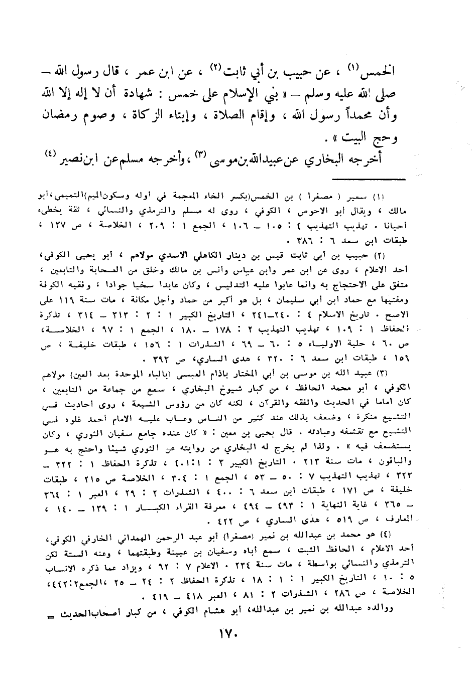 الْخِمْسِ، عَنْ حَبِيبِ بْنِ أَبِي ثَابِتٍ، عَنِ ابْنِ عُمَرَ، قَالَ رَسُولُ اللَّهِ صَلَّى اللَّهُ عَلَيْهِ وَسَلَّمَ بُنِيَ الإِسْلامُ عَلَى خَمْسٍ: شَهَادَةِ أَنْ لا إِلَهَ إِلا اللَّهُ وَأَنَّ مُحَمَّدًا رَسُولُ اللَّهِ، وَإِقَامِ الصَّلاةِ، وَإِيتَاءِ الزَّكَاةِ، وَصَوْمِ رَمَضَانَ، وَحَجِّ الْبَيْتِ.
