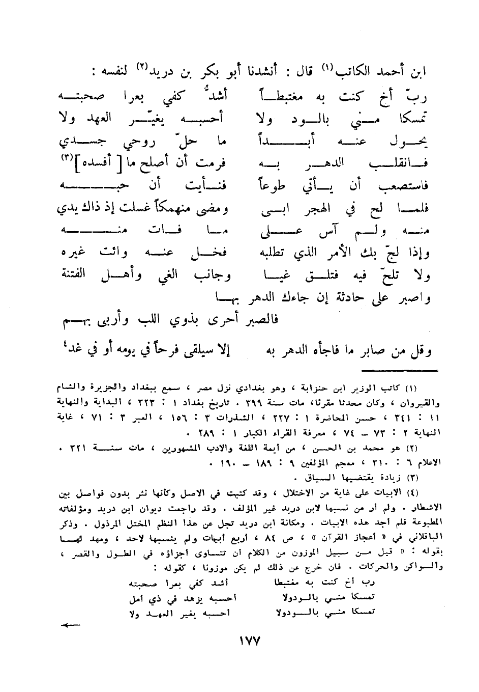 بْنُ أَحْمَدَ الْكَاتِبُ قَالَ: أَنْشَدَنَا أَبُو بَكْرِ بْنِ دُرَيْدٍ لِنَفْسِهِ: