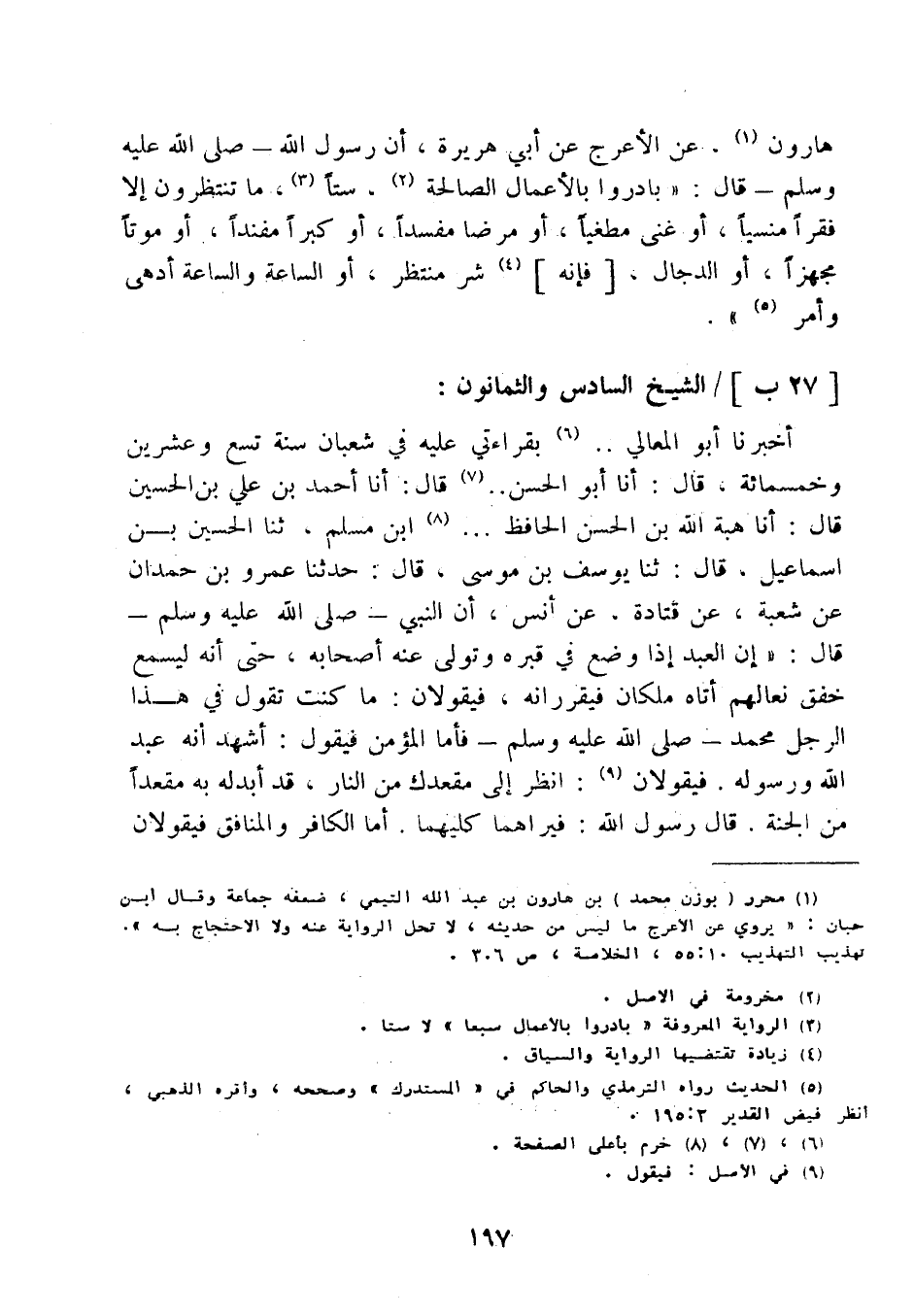 هَارُونَ، عَنِ الأَعْرَجِ، عَنْ أَبِي هُرَيْرَةَ، أَنَّ رَسُولَ اللَّهِ صَلَّى اللَّهُ عَلَيْهِ وَسَلَّمَ قَالَ: بَادِرُوا بِالأَعْمَالِ الصَّالِحَةِ، سِتًّا، مَا تَنْتَظِرُونَ إِلا فَقْرًا مُنْسِيًا، أَوْ غِنًى مُطْغِيًا، أَوْ مَرَضَا مُفْسِدًا، أَوْ كِبَرًا مُقَيِّدًا، أَوْ مَوْتًا مُجْهِزًا، أَوِ الدَّجَّالَ، فَإِنَّهُ شَرٌّ مُنْتَظَرٌ، أَوِ السَّاعَةِ وَالسَّاعَةُ أَدْهَى وَأَمَرُّ.