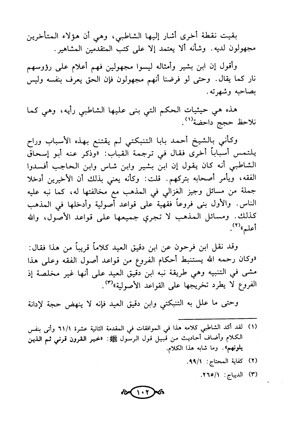 (¬1) لقد أكد الشاطبي كلامه هذا في الموافقات في المقدمة الثانية عشرة 1/ 61 وأتى بنفس الكلام وأضاف أحاديث من قبيل قول الرسول - صلى الله عليه وسلم -: "خير القرون قرني ثم الذين يلونهم". وما شابه هذا الكلام.