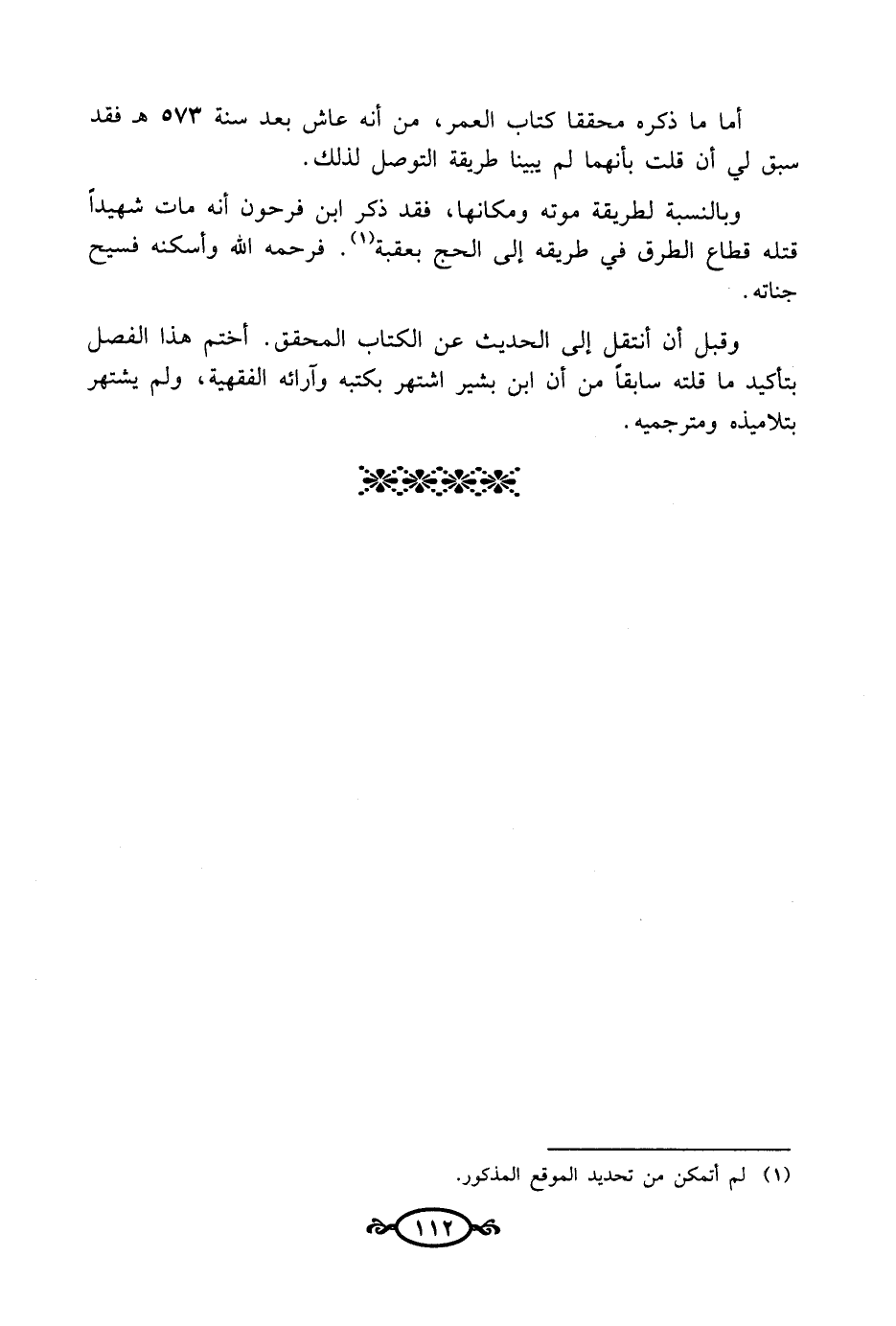 وقبل أن أنتقل إلى الحديث عن الكتاب المحقق. أختم هذا الفصل بتأكيد ما قلته سابقًا من أن ابن بشير اشتهر بكتبه وآرائه الفقهية، ولم يشتهر بتلاميذه ومترجميه.