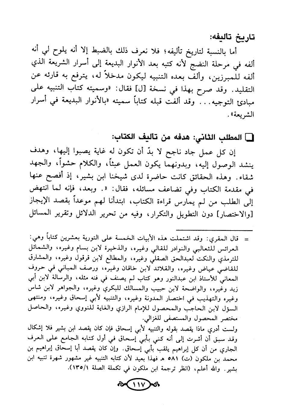 ولست أدري ماذا يقصد بقوله والتنبيه لأبي إسحاق فإن كان يقصد ابن بشير فلا إشكال وقد سبق أن أشرت إلى أنه كني بأبي إسحاق في أول كتابه الجامع على العرف الجاري من أن كل إبراهيم يلقب بأبي إسحاق. وإن كان يقصد أبا إسحاق إبراهيم بن محمد بن ملكون (ت) 581 هـ فهذا بعيد لأن كتابه التنبيه غير مشهور شهرة تنبيه ابن بشير. والله أعلم، (انظر ترجمة ابن ملكون في تكملة الصلة 1/ 135).