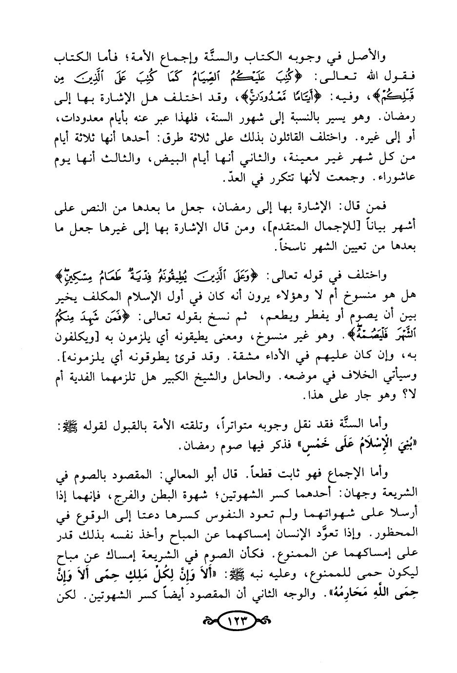 وأما الإجماع فهو ثابت قطعاً. قال أبو المعالي: المقصود بالصوم في الشريعة وجهان: أحدهما كسر الشهوتين؛ شهوة البطن والفرج، فإنهما إذا أرسلا على شهواتهما ولم تعود النفوس كسرها دعتا إلى الوقوع في المحظور. وإذا تعوَّد الإنسان إمساكهما عن المباح وأخذ نفسه بذلك قدر على إمساكهما عن الممنوع. فكأن الصوم في الشريعة إمساك عن مباح ليكون حمى للممنوع، وعليه نبه - صلى الله عليه وسلم -: "أَلاَ وَإِنَّ لِكُلِّ مَلِكٍ حِمَى أَلاَ وَإِنَّ حِمَى اللهِ مَحَارِمُهُ". والوجه الثاني أن المقصود أيضاً كسر الشهوتين. لكن