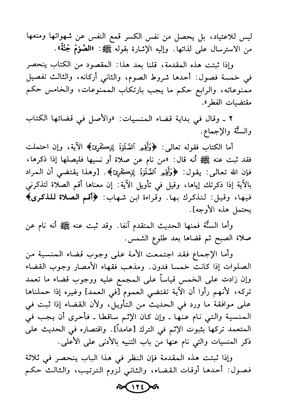 2 - وقال في بداية قضاء المنسيات: "والأصل في قضائها الكتاب والسنَّة والإجماع.