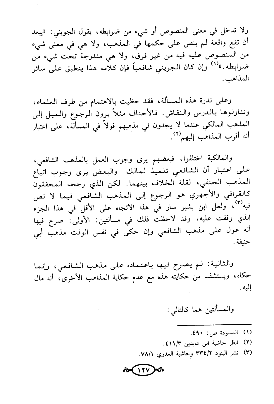والمالكية اختلفوا، فبعضهم يرى وجوب العمل بالمذهب الشافعي، على اعتبار أن الشافعي تلميذ لمالك. والبعض يرى وجوب اتباع المذهب الحنفي، لقلة الخلاف بينهما. لكن الذي رجحه المحققون كالقرافي والأجهري هو الرجوع إلى المذهب الشافعي فيما لا نص فيه (¬3)، ولعل ابن بشير سار في هذا الاتجاه على الأقل في هذا الجزء الذي وقفت عليه، وقد لاحظت ذلك في مسألتين: الأولى: صرح فيها أنه عول على مذهب الشافعي وإن حكى في نفس الوقت مذهب أبي حنيفة.