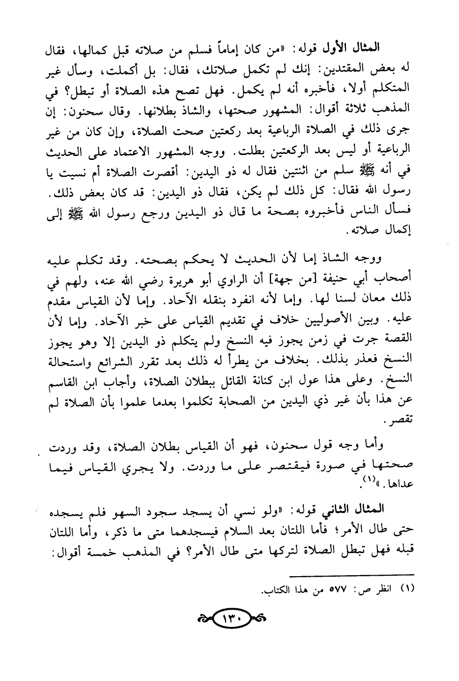 المثال الأول قوله: "من كان إماماً فسلم من صلاته قبل كمالها، فقال له بعض المقتدين: إنك لم تكمل صلاتك، فقال: بل أكملت، وسأل غير المتكلم أولا، فأخبره أنه لم يكمل. فهل تصح هذه الصلاة أو تبطل؟ في المذهب ثلاثة أقوال: المشهور صحتها، والشاذ بطلانها. وقال سحنون: إن جرى ذلك في الصلاة الرباعية بعد ركعتين صحت الصلاة، وإن كان من غير الرباعية أو ليس بعد الركعتين بطلت. ووجه المشهور الاعتماد على الحديث في أنه - صلى الله عليه وسلم - سلم من اثنتين فقال له ذو اليدين: أقصرت الصلاة أم نسيت يا رسول الله فقال: كل ذلك لم يكن، فقال ذو اليدين: قد كان بعض ذلك. فسأل الناس فأخبروه بصحة ما قال ذو اليدين ورجع رسول الله - صلى الله عليه وسلم - إلى إكمال صلاته.