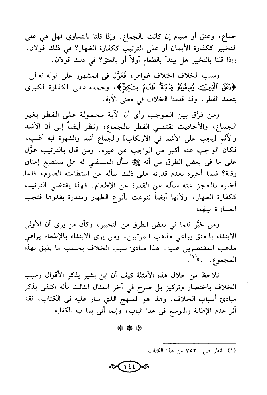ومن فرَّق بين الموجب رأى أن الآية محمولة على الفطر بغير الجماع، والأحاديث تقتضي الفطر بالجماع، ونظر أيضاً إلى أن الأشد والآثم [يجب على الأشد في الارتكاب] والجماع أشد والشهوة فيه أغلب، فكان الواجب عنه أكبر من الواجب عن غيره. ومن قال بالترتيب عوَّل على ما في بعض الطرق من أنه - صلى الله عليه وسلم - سأل المستفتي له هل يستطيع إعتاق رقبة؟ فلما أخبره بعدم قدرته على ذلك سأله عن استطاعته الصوم، فلما أخبره بالعجز عنه سأله عن القدرة عن الإطعام. فهذا يقتضي الترتيب ككفارة الظهار، ولأنها أيضًا تنوعت بأنواع الظهار ومقدرة بقدرها فتجب المساواة بينهما.
