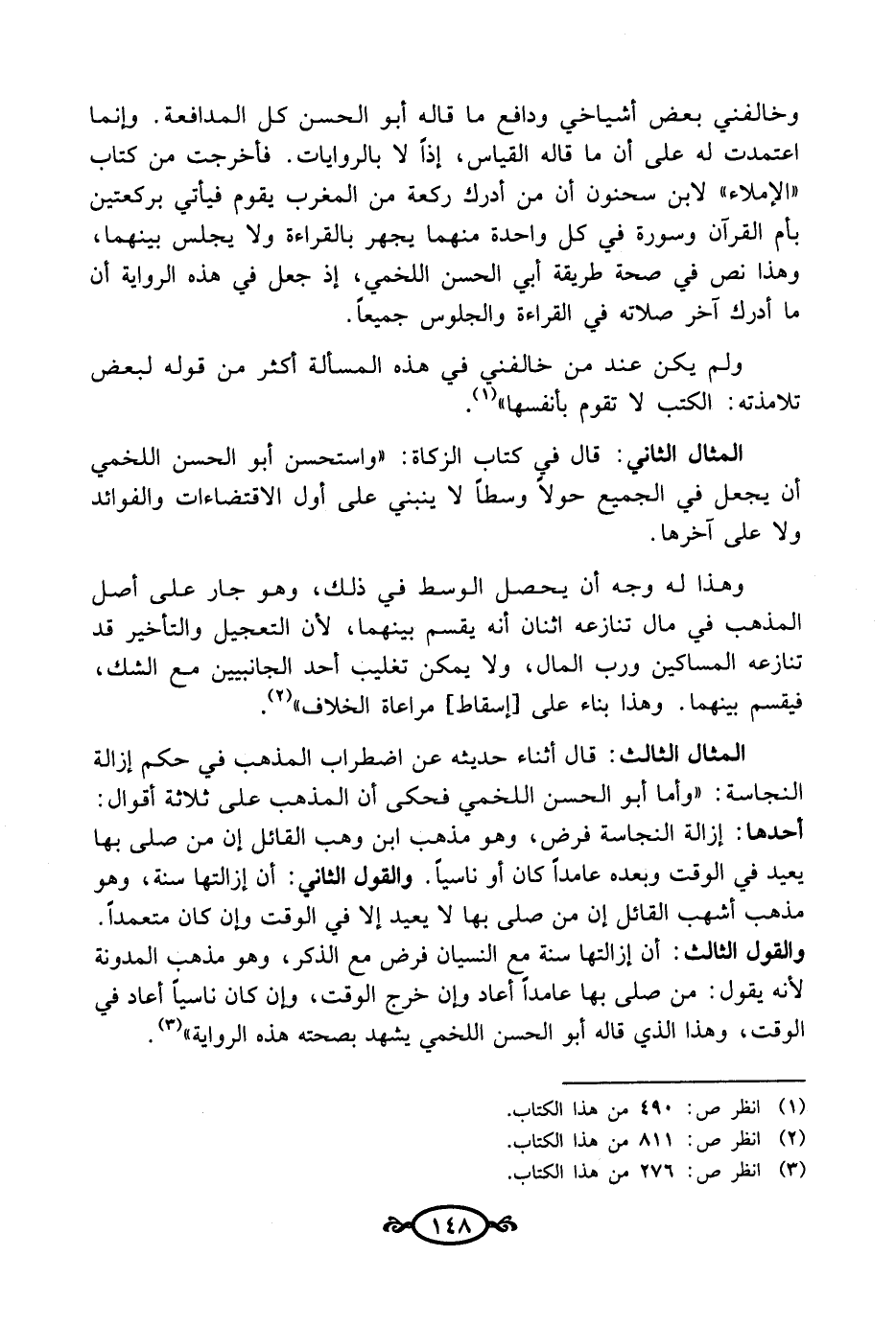 المثال الثالث: قال أثناء حديثه عن اضطراب المذهب في حكم إزالة النجاسة: "وأما أبو الحسن اللخمي فحكى أن المذهب على ثلاثة أقوال: أحدها: إزالة النجاسة فرض، وهو مذهب ابن وهب القائل إن من صلى بها يعيد في الوقت وبعده عامدًا كان أو ناسيًا. والقول الثاني: أن إزالتها سنة، وهو مذهب أشهب القائل إن من صلى بها لا يعيد إلا في الوقت وإن كان متعمدًا. والقول الثالث: أن إزالتها سنة مع النسيان فرض مع الذكر، وهو مذهب المدونة لأنه يقول: من صلى بها عامدًا أعاد وإن خرج الوقت، وإن كان ناسيًا أعاد في الوقت، وهذا الذي قاله أبو الحسن اللخمي يشهد بصحته هذه الرواية" (¬3).