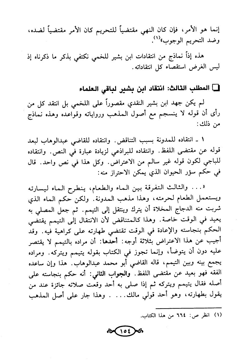 1 - انتقاده للمدونة بسبب التناقض. وانتقاده للقاضي عبد الوهاب لبعد قوله عن مقتضى اللفظ. وانتقاده للبراذعي لزيادة عبارة في النص. وانتقاده للباجي لكون قوله غير سالم من الاعتراض. وكل هذا في نص واحد. قال في حكم سؤر الحيوان الذي يمكن الاحتراز منه: