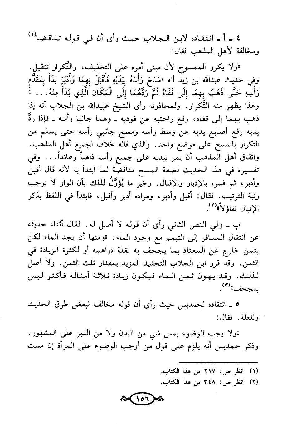 ب - وفي النص الثاني رأى أن قوله لا أصل له. فقال أثناء حديثه عن انتقال المسافر إلى التيمم مع وجود الماء: "ومنها أن يجد الماء لكن بثمن خارج عن المعتاد بما يجحف به لقلة دراهمه أو لكثرة الزيادة في الثمن. وقد قرر ابن الجلاب التحديد المزيد بمقدار ثلث الثمن. ولا أصل لذلك. وقد يهون ثمن الماء فيكون زيادة ثلاثة أمثاله فأكثر ليس بمجحف".