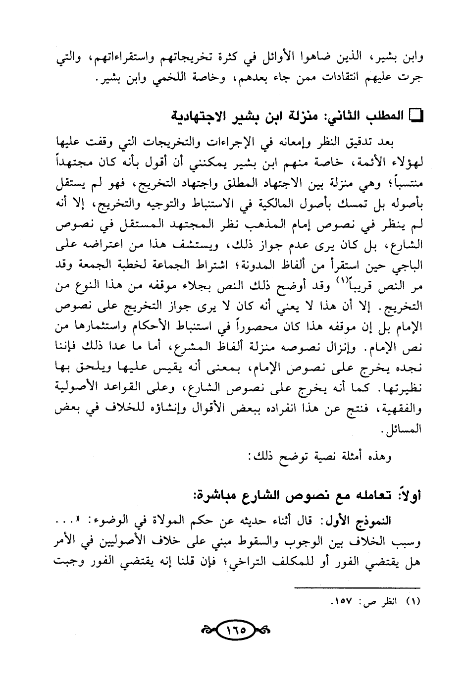 النموذج الأول: قال أثناء حديثه عن حكم المولاة في الوضوء: " ... وسبب الخلاف بين الوجوب والسقوط مبني على خلاف الأصوليين في الأمر هل يقتضي الفور أو للمكلف التراخي؛ فإن قلنا إنه يقتضي الفور وجبت