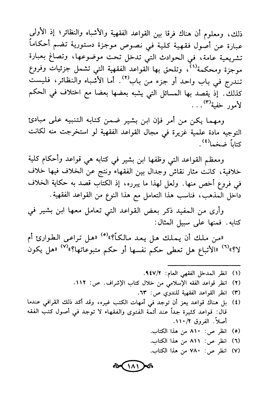 (¬4) بل هناك قواعد يعز أن توجد في أمهات الكتب غيره، وقد أكد ذلك القرافي عندما قال: قواعد كثيرة جدًا عند أئمة الفتوى والفقهاء لا توجد في أصول كتب الفقه أصلاً. الفروق 2/ 110.