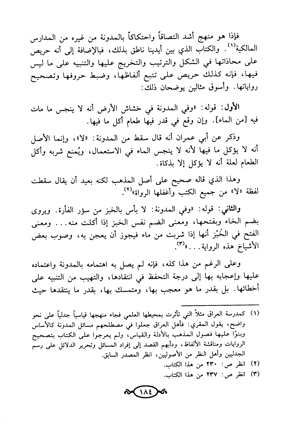 (¬1) كمدرسة العراق مثلاً التي تأثرت بمحيطها العلمي فجاء منهجها قياسياً جدليًا على نحو واضح، يقول المقري: فأهل العراق جعلوا في مصطلحهم مسائل المدونة كالأساس وبنوْا عليها فصول المذهب بالأدلة والقياس، ولم يعرجوا على الكتاب بتصحيح الروايات ومناقشة الألفاظ، ودأبهم القصد إلى إفراد المسائل وتحرير الدلائل على رسم الجدليين وأهل النظر من الأصوليين، انظر المصدر السابق.
