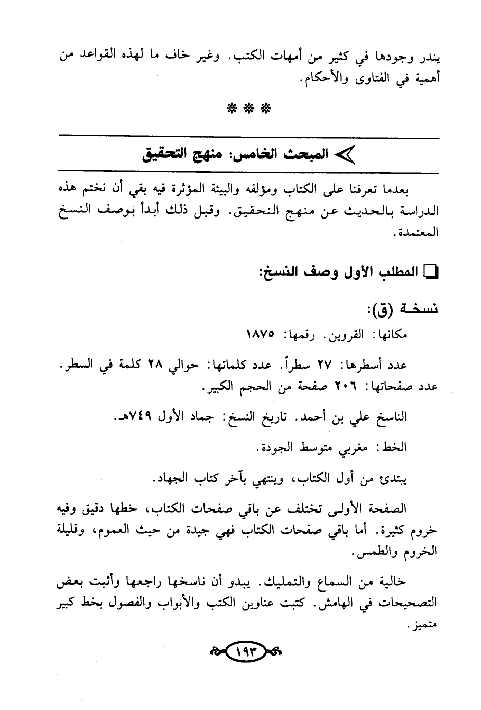 بعدما تعرفنا على الكتاب ومؤلفه والبيئة المؤثرة فيه بقي أن نختم هذه الدراسة بالحديث عن منهج التحقيق. وقبل ذلك أبدأ بوصف النسخ المعتمدة.