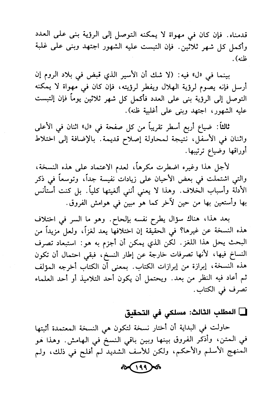 لأجل هذا وغيره اضطرت مكرهاً، لعدم الاعتماد على هذه النسخة، والتي اشتملت في بعض الأحيان على زيادات نفيسة جداً، وتوسعاً في ذكر الأدلة وأسباب الخلاف. وهذا لا يعني أنني ألغيتها كلياً. بل كنت أستأنس بها وأستعين بها من حين لآخر كما هو مبين في هوامش الفروق.