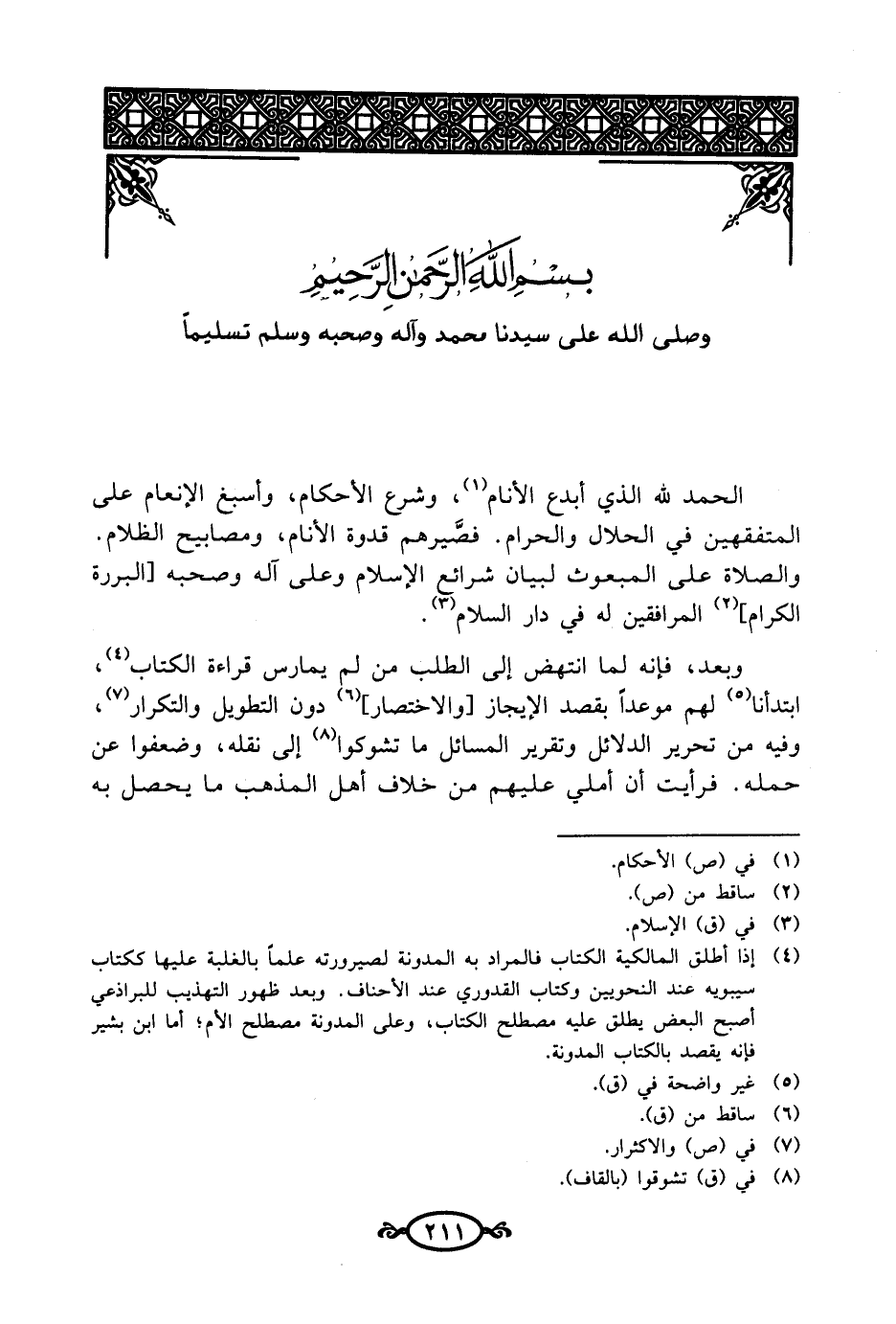 الحمد لله الذي أبدع الأنام (¬1)، وشرع الأحكام، وأسبغ الإنعام على المتفقهين في الحلال والحرام. فصَّيرهم قدوة الأنام، ومصابيح الظلام. والصلاة على المبعوث لبيان شرائع الإِسلام وعلى آله وصحبه [البررة الكرام] (¬2) المرافقين له في دار السلام (¬3).