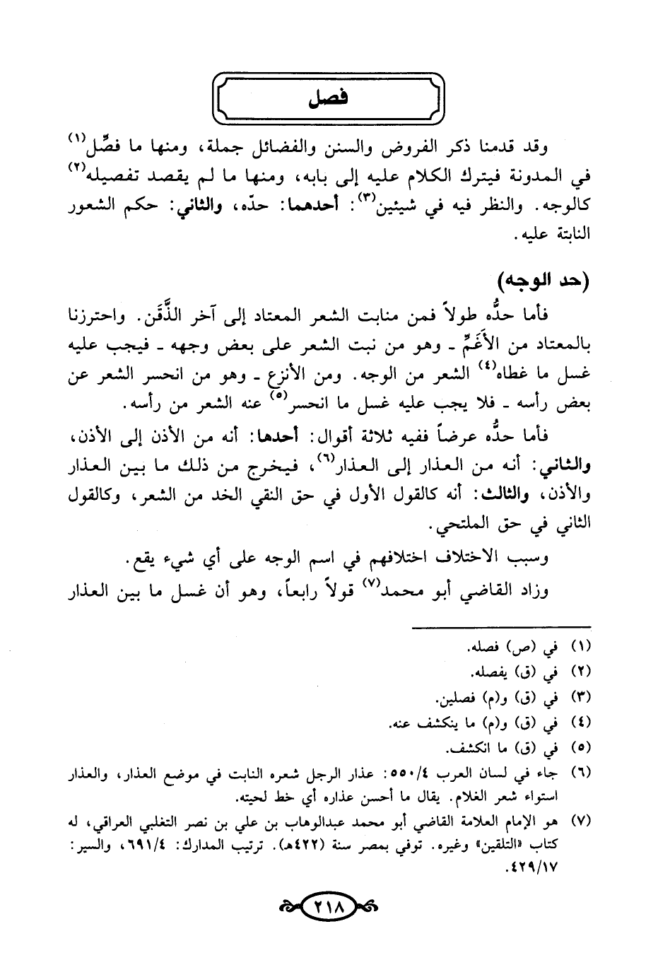 وقد قدمنا ذكر الفروض والسنن والفضائل جملة، ومنها ما فصِّل (¬1) في المدونة فيترك الكلام عليه إلى بابه، ومنها ما لم يقصد تفصيله (¬2) كالوجه. والنظر فيه في شيئين (¬3): أحدهما: حدّه، والثاني: حكم الشعور النابتة عليه.