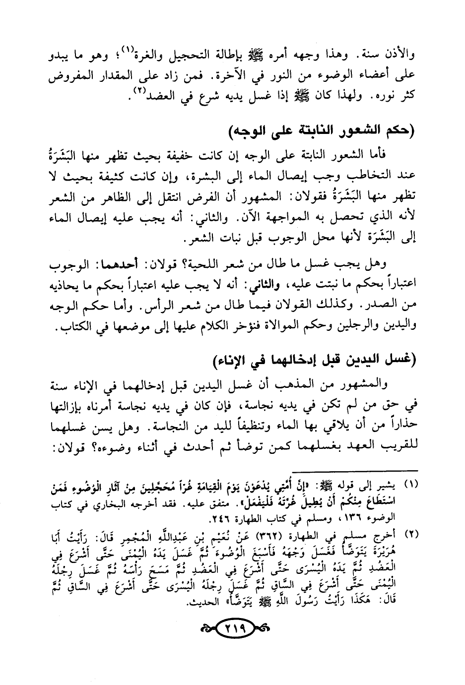 (¬1) يشير إلى قوله - صلى الله عليه وسلم -: "إِنَّ أُمَّتِي يُدْعَوْن يَوْمَ الْقِيَامَةِ غُرَاً مُحَجَّلِينَ مِنْ آثَارِ الْوُضُوءِ فَمَنْ اسْتَطَاعَ مِنْكُمْ أَنْ يُطِيلَ غُرَّتَهُ فَلْيَفْعَلْ". متفق عليه. فقد أخرجه البخاري في كتاب الوضوء 136، ومسلم في كتاب الطهارة 246.