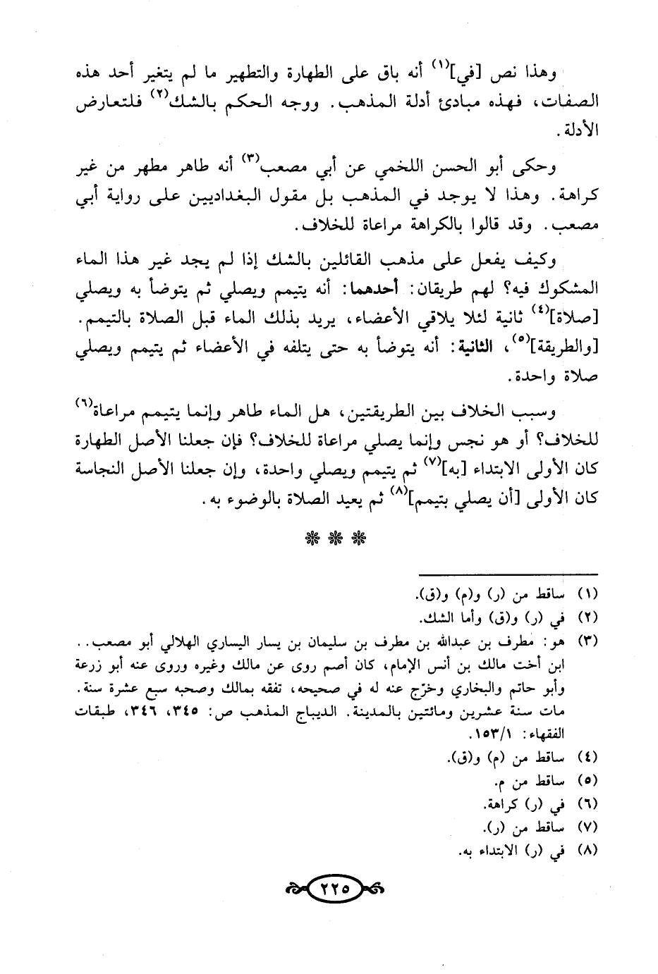 (¬3) هو: مطرف بن عبد الله بن مطرف بن سليمان بن يسار اليساري الهلالي أبو مصعب .. ابن أخت مالك بن أنس الإمام، كان أصم روى عن مالك وغيره وروى عنه أبو زرعة وأبو حاتم والبخاري وخرّج عنه له في صحيحه، تفقه بمالك وصحبه سبع عشرة سنة. مات سنة عشرين ومائتين بالمدينة. الديباج المذهب ص: 345، 346، طبقات الفقهاء: 1/ 153.