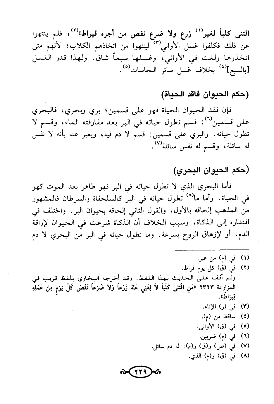 فإن فقد الحيوان الحياة فهو على قسمين؛ بري وبحري، فالبحري على قسمين (¬6): قسم تطول حياته في البر بعد مفارقته الماء، وقسم لا تطول حياته. والبري على قسمين: قسم لا دم فيه، ويعبر عنه بأنه لا نفس له سائلة، وقسم له نفس سائلة (¬7).