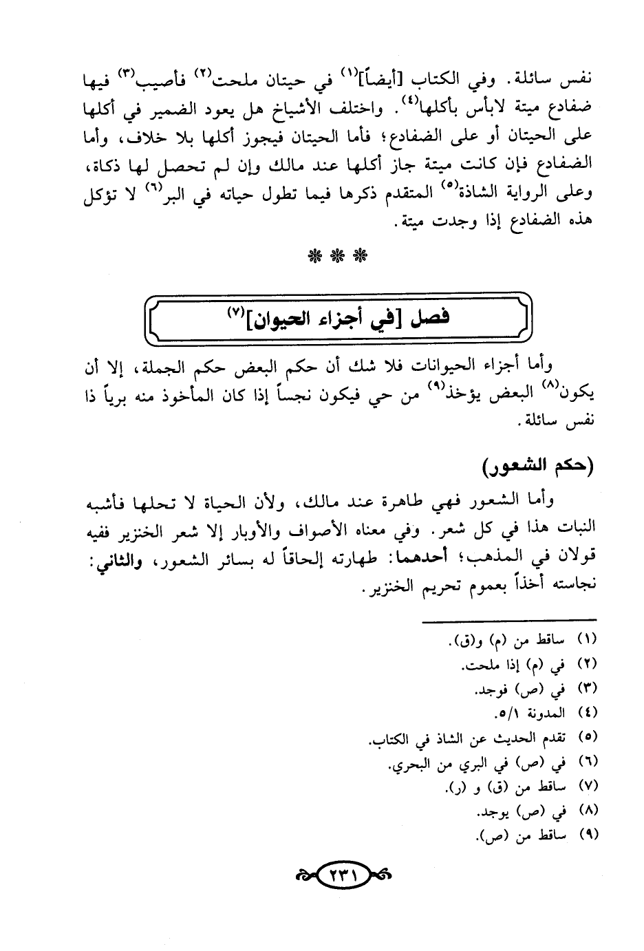 نفس سائلة. وفي الكتاب [أيضاً] (¬1) في حيتان ملحت (¬2) فأصيب (¬3) فيها ضفادع ميتة لابأس بأكلها (¬4). واختلف الأشياخ هل يعود الضمير في أكلها على الحيتان أو على الضفادع؛ فأما الحيتان فيجوز أكلها بلا خلاف، وأما الضفادع فإن كانت ميتة جاز أكلها عند مالك وإن لم تحصل لها ذكاة، وعلى الرواية الشاذة (¬5) المتقدم ذكرها فيما تطول حياته في البر (¬6) لا تؤكل هذه الضفادع إذا وجدت ميتة.
