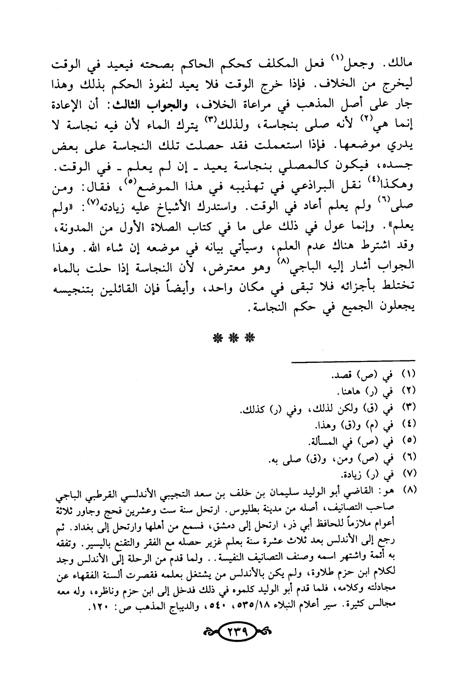 (¬8) هو: القاضي أبو الوليد سليمان بن خلف بن سعد التجيبي الأندلسي القرطبي الباجي صاحب التصانيف، أصله من مدينة بطليوس. ارتحل سنة ست وعشرين فحج وجاور ثلاثة أعوام ملازمًا للحافظ أبي ذر، ارتحل إلى دمشق، فسمع من أهلها وارتحل إلى بغداد. ثم رجع إلى الأندلس بعد ثلاث عشرة سنة بعلم غزير حصله مع الفقر والتقنع باليسير. وتفقه به أئمة واشتهر اسمه وصنف التصانيف النفيسة .. ولما قدم من الرحلة إلى الأندلس وجد لكلام ابن حزم طلاوة، ولم يكن بالأندلس من يشتغل بعلمه فقصرت ألسنة الفقهاء عن مجادلته وكلامه، فلما قدم أبو الوليد كلموه في ذلك فدخل إلى ابن حزم وناظره، وله معه مجالس كثيرة. سير أعلام النبلاء 18/ 535، 540، والديباج المذهب ص: 120.