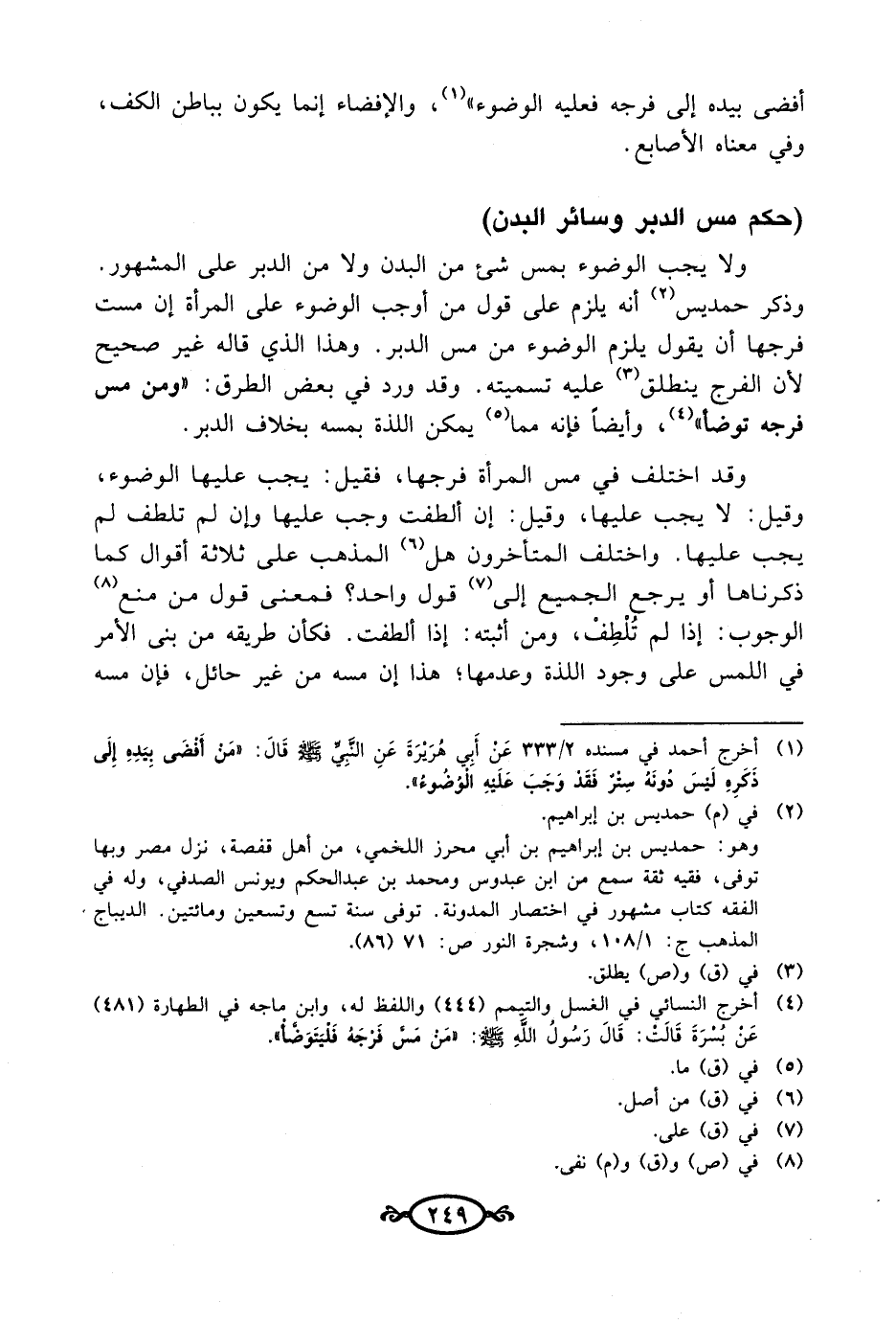 (¬1) أخرج أحمد في مسنده 2/ 333 عَنْ أَبِي هُرَيْرَةَ عَنِ النَّبِيِّ - صلى الله عليه وسلم - قَالَ: "مَنْ أَفْضَى بِيَدِهِ إِلَى ذَكَرِهِ لَيْسَ دُونَهُ سِتْرٌ فَقَدْ وَجَب عَلَيْهِ الْوُضُوءُ".
