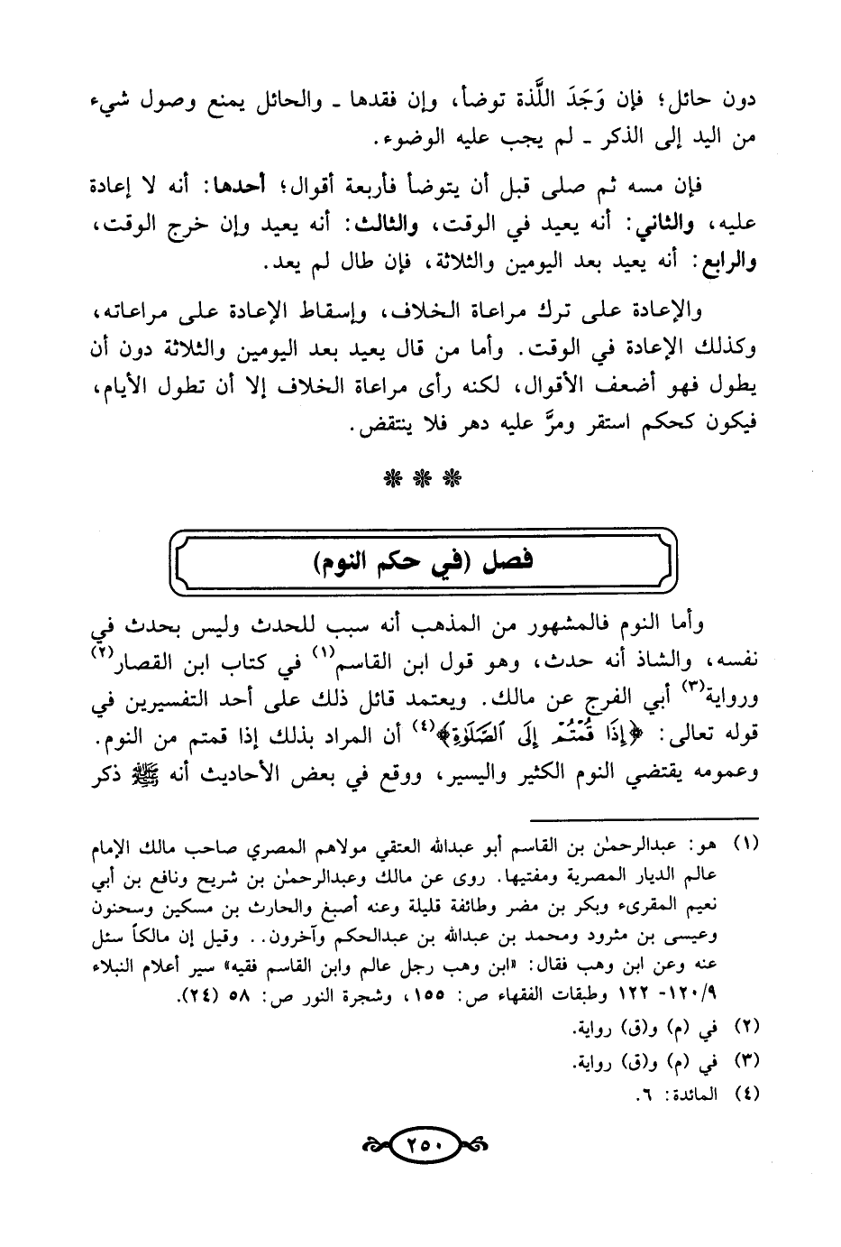 (¬1) هو: عبد الرحمن بن القاسم أبو عبد الله العتقي مولاهم المصري صاحب مالك الإمام عالم الديار المصرية ومفتيها. روى عن مالك وعبد الرحمن بن شريح ونافع بن أبي نعيم المقرئ وبكر بن مضر وطائفة قليلة وعنه أصبغ والحارث بن مسكين وسحنون وعيسى بن مثرود ومحمد بن عبد الله بن عبد الحكم وآخرون .. وقيل إن مالكاً سئل عنه وعن ابن وهب فقال: "ابن وهب رجل عالم وابن القاسم فقيه" سير أعلام النبلاء 9/ 120 - 122 وطبقات الفقهاء ص: 155، وشجرة النور ص: 58 (24).