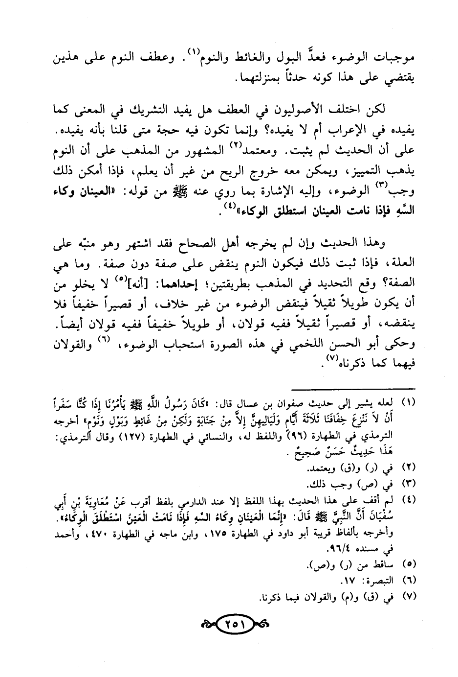 لكن اختلف الأصوليون في العطف هل يفيد التشريك في المعنى كما يفيده في الإعراب أم لا يفيده؟ وإنما تكون فيه حجة متى قلنا بأنه يفيده. على أن الحديث لم يثبت. ومعتمد (¬2) المشهور من المذهب على أن النوم يذهب التمييز، ويمكن معه خروج الريح من غير أن يعلم، فإذا أمكن ذلك وجب (¬3) الوضوء، وإليه الإشارة بما روي عنه - صلى الله عليه وسلم - من قوله: "العينان وكاء السَّهِ فإذا نامت العينان استطلق الوكاء" (¬4).