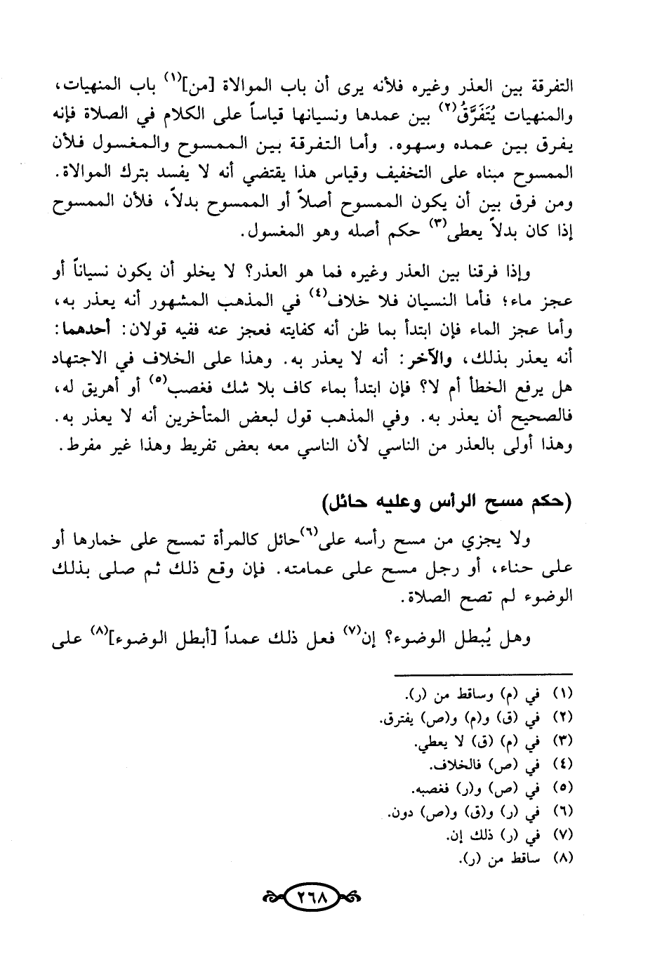 التفرقة بين العذر وغيره فلأنه يرى أن باب الموالاة [من] (¬1) باب المنهيات، والمنهيات يُتَفَرَّقُ (¬2) بين عمدها ونسيانها قياساً على الكلام في الصلاة فإنه يفرق بين عمده وسهوه. وأما التفرقة بين الممسوح والمغسول فلأن الممسوح مبناه على التخفيف وقياس هذا يقتضي أنه لا يفسد بترك الموالاة. ومن فرق بين أن يكون الممسوح أصلاً أو الممسوح بدلاً، فلأن الممسوح إذا كان بدلاً يعطى (¬3) حكم أصله وهو المغسول.