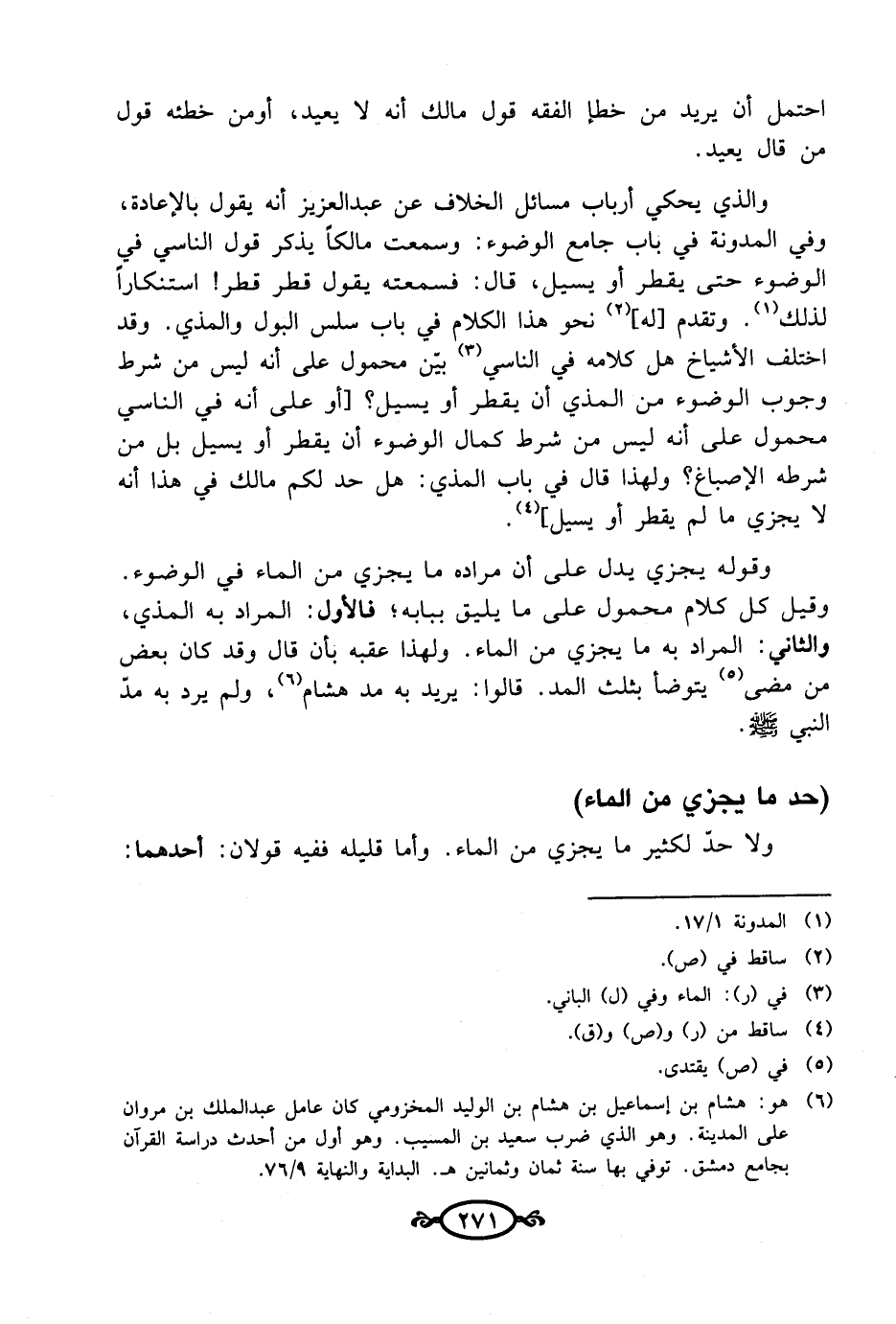وقوله يجزي يدل على أن مراده ما يجزي من الماء في الوضوء. وقيل كل كلام محمول على ما يليق ببابه؛ فالأول: المراد به المذي، والثاني: المراد به ما يجزي من الماء. ولهذا عقبه بأن قال وقد كان بعض من مضى (¬5) يتوضأ بثلث المد. قالوا: يريد به مد هشام (¬6)، ولم يرد به مدّ النبي - صلى الله عليه وسلم -.