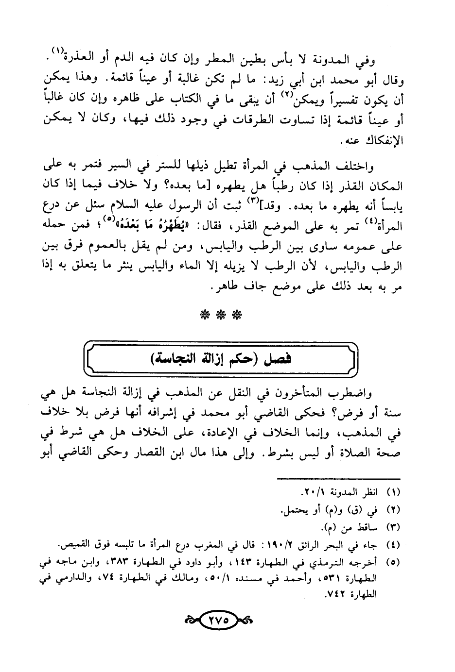 واضطرب المتأخرون في النقل عن المذهب في إزالة النجاسة هل هي سنة أو فرض؟ فحكى القاضي أبو محمد في إشرافه أنها فرض بلا خلاف في المذهب، وإنما الخلاف في الإعادة، على الخلاف هل هي شرط في صحة الصلاة أو ليس بشرط. وإلى هذا مال ابن القصار وحكى القاضي أبو