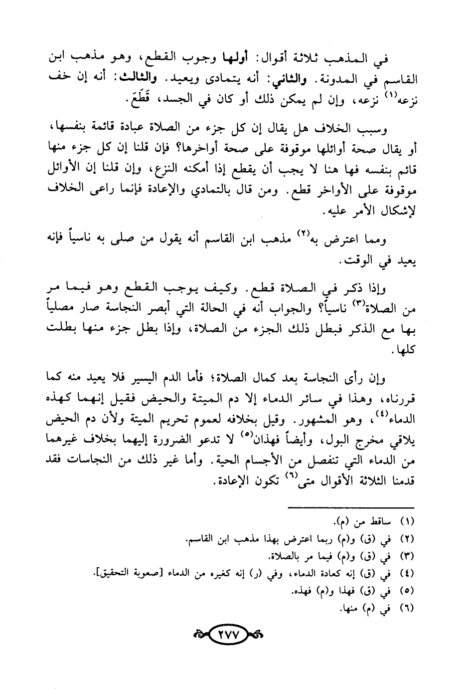 وإن رأى النجاسة بعد كمال الصلاة؛ فأما الدم اليسير فلا يعيد منه كما قررناه، وهذا في سائر الدماء إلا دم الميتة والحيض فقيل إنهما كهذه الدماء (¬4)، وهو المشهور. وقيل بخلافه لعموم تحريم الميتة ولأن دم الحيض يلاقي مخرج البول، وأيضاً فهذان (¬5) لا تدعو الضرورة إليهما بخلاف غيرهما من الدماء التي تنفصل من الأجسام الحية. وأما غير ذلك من النجاسات فقد قدمنا الثلاثة الأقوال متى (¬6) تكون الإعادة.