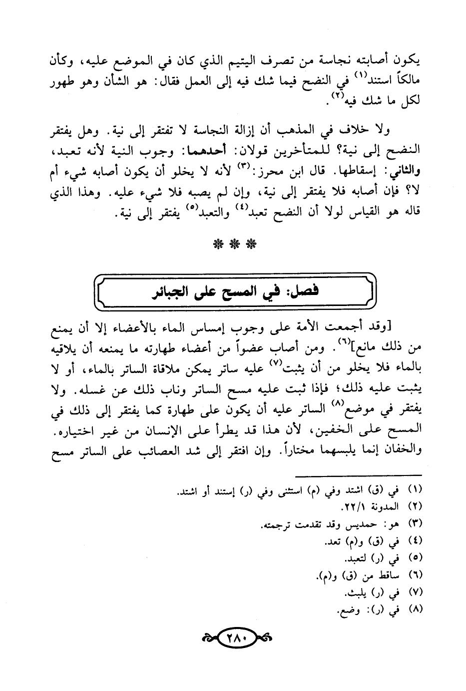 ولا خلاف في المذهب أن إزالة النجاسة لا تفتقر إلى نية. وهل يفتقر النضح إلى نية؟ للمتأخرين قولان: أحدهما: وجوب النية لأنه تعبد، والثاني: إسقاطها. قال ابن محرز: (¬3) لأنه لا يخلو أن يكون أصابه شيء أم لا؟ فإن أصابه فلا يفتقر إلى نية، وإن لم يصبه فلا شيء عليه. وهذا الذي قاله هو القياس لولا أن النضح تعبد (¬4) والتعبد (¬5) يفتقر إلى نية.