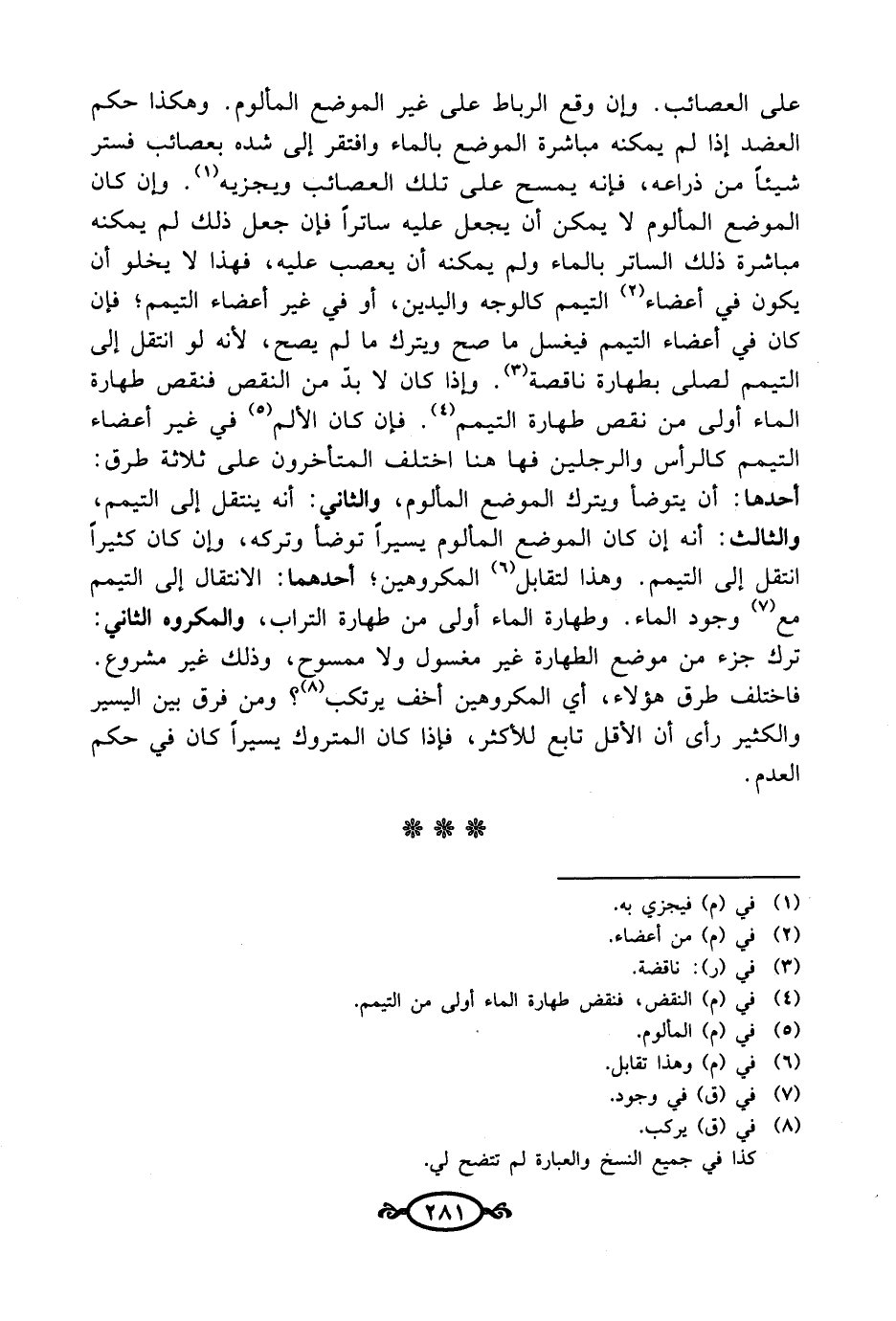 على العصائب. وإن وقع الرباط على غير الموضع المألوم. وهكذا حكم العضد إذا لم يمكنه مباشرة الموضع بالماء وافتقر إلى شده بعصائب فستر شيئاً من ذراعه، فإنه يمسح على تلك العصائب ويجزيه (¬1). وإن كان الموضع المألوم لا يمكن أن يجعل عليه ساترًا فإن جعل ذلك لم يمكنه مباشرة ذلك الساتر بالماء ولم يمكنه أن يعصب عليه، فهذا لا يخلو أن يكون في أعضاء (¬2) التيمم كالوجه واليدين، أو في غير أعضاء التيمم؛ فإن كان في أعضاء التيمم فيغسل ما صح ويترك ما لم يصح، لأنه لو انتقل إلى التيمم لصلى بطهارة ناقصة (¬3). وإذا كان لا بدّ من النقص فنقص طهارة الماء أولى من نقص طهارة التيمم (¬4). فإن كان الألم (¬5) في غير أعضاء التيمم كالرأس والرجلين فها هنا اختلف المتأخرون على ثلاثة طرق: أحدها: أن يتوضأ ويترك الموضع المألوم، والثاني: أنه ينتقل إلى التيمم، والثالث: أنه إن كان الموضع المألوم يسيرًا توضأ وتركه، وإن كان كثيراً انتقل إلى التيمم. وهذا لتقابل (¬6) المكروهين؛ أحدهما: الانتقال إلى التيمم مع (¬7) وجود الماء. وطهارة الماء أولى من طهارة التراب، والمكروه الثاني: ترك جزء من موضع الطهارة غير مغسول ولا ممسوح، وذلك غير مشروع. فاختلف طرق هؤلاء، أي المكروهين أخف يرتكب (¬8)؟ ومن فرق بين اليسير والكثير رأى أن الأقل تابع للأكثر، فإذا كان المتروك يسيراً كان في حكم العدم.