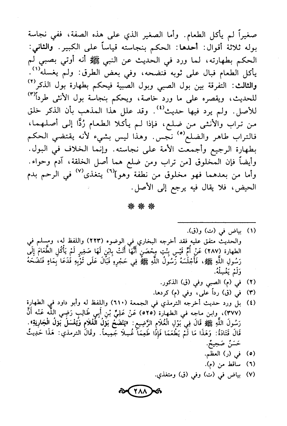 صغيراً لم يأكل الطعام. وأما الصغير الذي على هذه الصفة، ففي نجاسة بوله ثلاثة أقوال: أحدها: الحكم بنجاسته قياساً على الكبير. والثاني: الحكم بطهارته، لما ورد في الحديث عن النبي - صلى الله عليه وسلم - أنه أوتي بصبي لم يأكل الطعام فبال على ثوبه فنضحه، وفي بعض الطرق: ولم يغسله (¬1). والثالث: التفرقة بين بول الصبي وبول الصبية فيحكم بطهارة بول الذكر (¬2) للحديث، ويقصره على ما ورد خاصة، ويحكم بنجاسة بول الأنثى طرداً (¬3) للأصل. ولم يرد فيها حديث (¬4). وقد علل هذا المذهب بأن الذكر خلق من تراب والأنثى من ضلع، فإذا لم يأكلا الطعام رُدَّا إلى أصلهما، فالتراب طاهر والضلع (¬5) نجس. وهذا ليس بشيء لأنه يقتضي الحكم بطهارة الرجيع وأجمعت الأمة على نجاسته. وإنما الخلاف في البول. وأيضاً فإن المخلوق [من تراب ومن ضلع هما أصل الخلقة، آدم وحواء. وأما من بعدهما فهو مخلوق من نطفة وهو] (¬6) يتغذى (¬7) في الرحم بدم الحيض، فلا يقال فيه يرجع إلى الأصل.