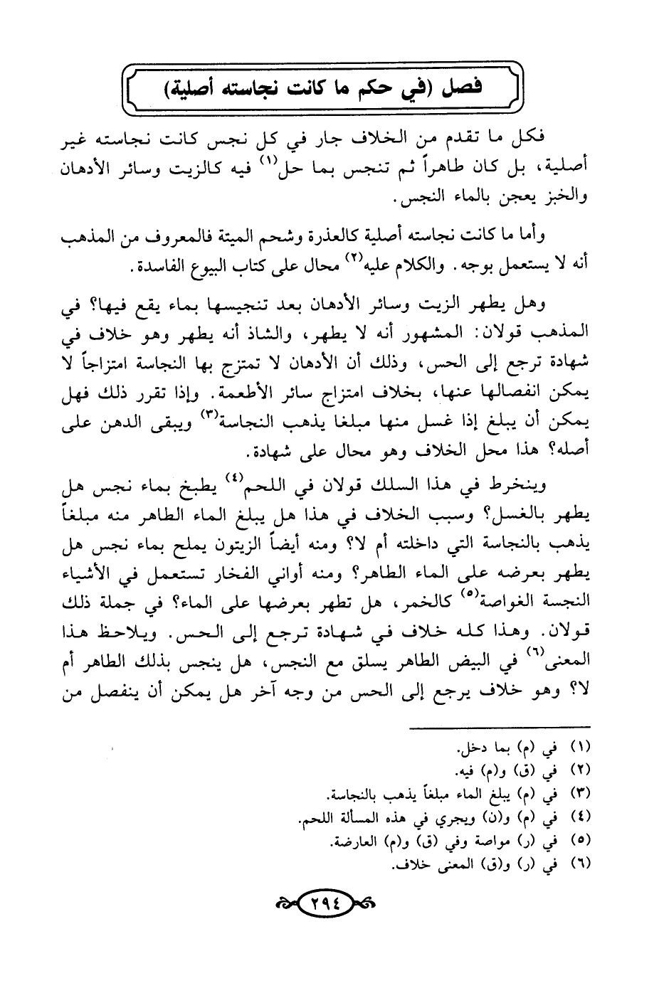 وهل يطهر الزيت وسائر الأدهان بعد تنجيسها بماء يقع فيها؟ في المذهب قولان: المشهور أنه لا يطهر، والشاذ أنه يطهر وهو خلاف في شهادة ترجع إلى الحس، وذلك أن الأدهان لا تمتزج بها النجاسة امتزاجاً لا يمكن انفصالها عنها، بخلاف امتزاج سائر الأطعمة. وإذا تقرر ذلك فهل يمكن أن يبلغ إذا غسل منها مبلغا يذهب النجاسة (¬3) ويبقى الدهن على أصله؟ هذا محل الخلاف وهو محال على شهادة.