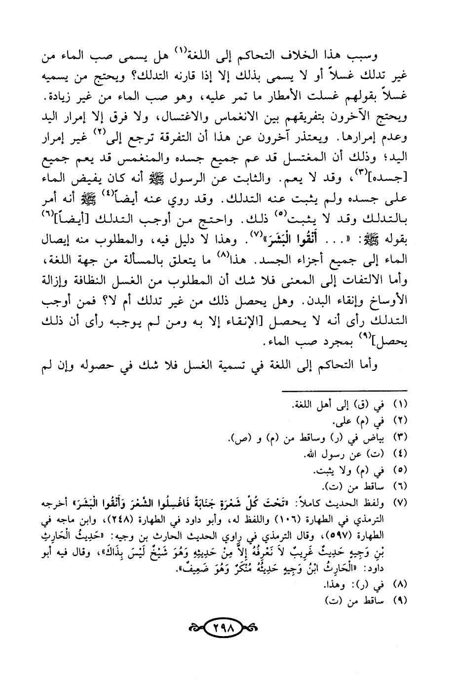 (¬7) ولفظ الحديث كاملاً: "تَحْتَ كُلِّ شَعْرَةٍ جَنَابَةٌ فَاغْسِلُوا الشَّعْرَ وَأَنْقُوا الْبَشَرَ" أخرجه الترمذي في الطهارة (106) واللفظ له، وأبو داود في الطهارة (248)، وابن ماجه في الطهارة (597)، وقال الترمذي في راوي الحديث الحارث بن وجيه: "حَدِيثُ الْحَارِثِ بْنِ وَجِيهٍ حَديثٌ غَرِيبٌ لاَ نَعْرِفُهُ إلاَّ مِنْ حَدِيثِهِ وهُوَ شَيْخٌ لَيْسَ بِذَاكَ"، وقال فيه أبو داود: "الْحَارِثُ ابْنُ وَجِيهٍ حَدِيثُهُ مُنْكَرٌ وَهُوَ ضَعِيفٌ".