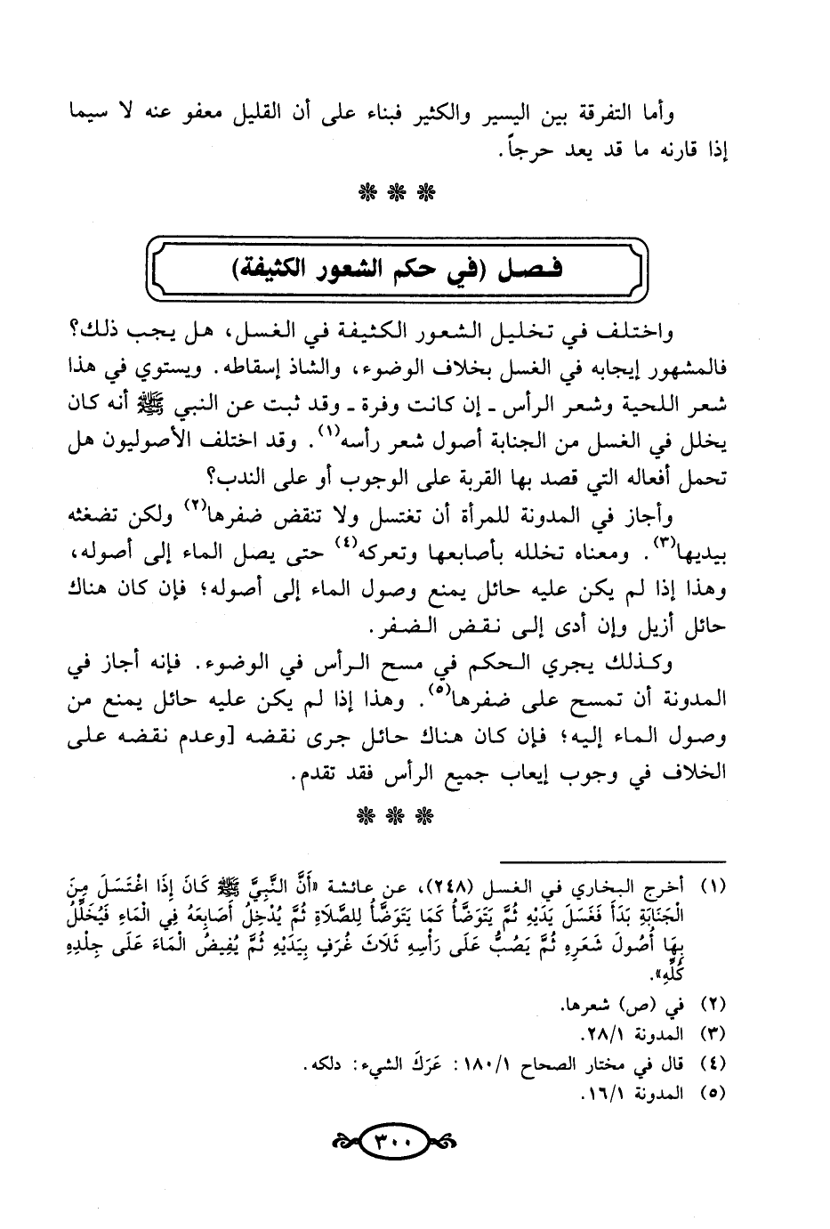 (¬1) أخرج البخاري في الغسل (248)، عن عائشة "أَنَ النَّبيَّ - صلى الله عليه وسلم - كَانَ إذا اغْتَسَلَ مِنَ الْجَنَابَةِ بَدَأَ فَغَسَلَ يَدَيْهِ ثُمّ يَتَوَضأُ كَمَا يَتَوَضَّأُ لِلصَّلاَةِ ثُمَّ يُدْخَلُ أَصَابِعَهُ فِي الْمَاءِ فَيُخَلِّلُ بهَا أُصُولَ شَعَرِهِ ثُمَّ يَصُبُّ عَلَى رَأسِهِ ثَلاَثَ غُرَفِ بيَدَيْهِ ثُمَّ يُفِيضُ الْمَاءَ عَلَى جِلْدِهِ كُلِّهِ".