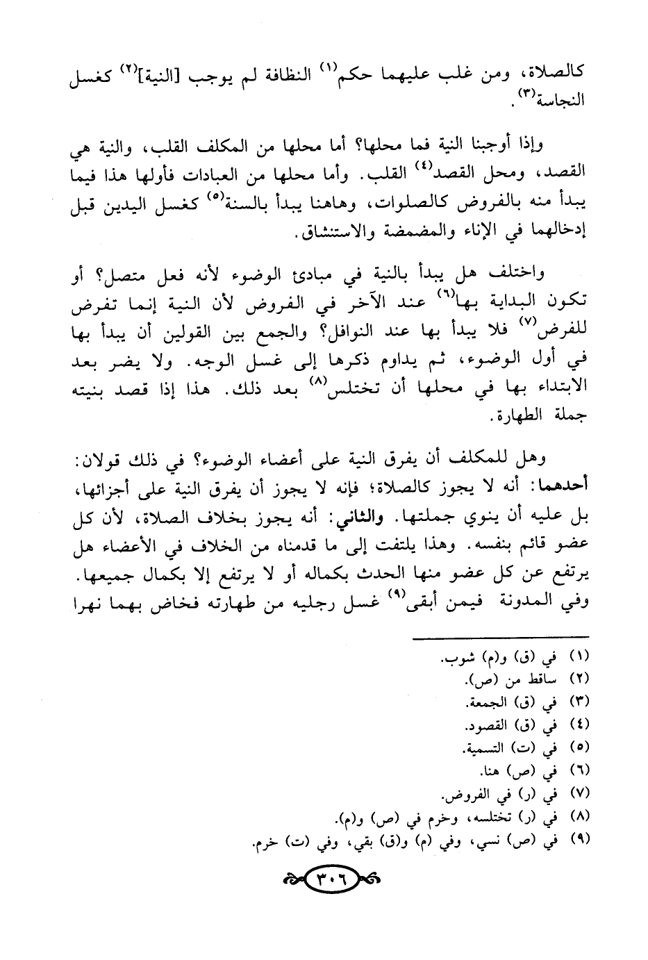 واختلف هل يبدأ بالنية في مبادئ الوضوء لأنه فعل متصل؟ أو تكون البداية بها (¬6) عند الآخر في الفروض لأن النية إنما تفرض للفرض (¬7) فلا يبدأ بها عند النوافل؟ والجمع بين القولين أن يبدأ بها في أول الوضوء، ثم يداوم ذكرها إلى غسل الوجه. ولا يضر بعد الابتداء بها في محلها أن تختلس (¬8) بعد ذلك. هذا إذا قصد بنيته جملة الطهارة.