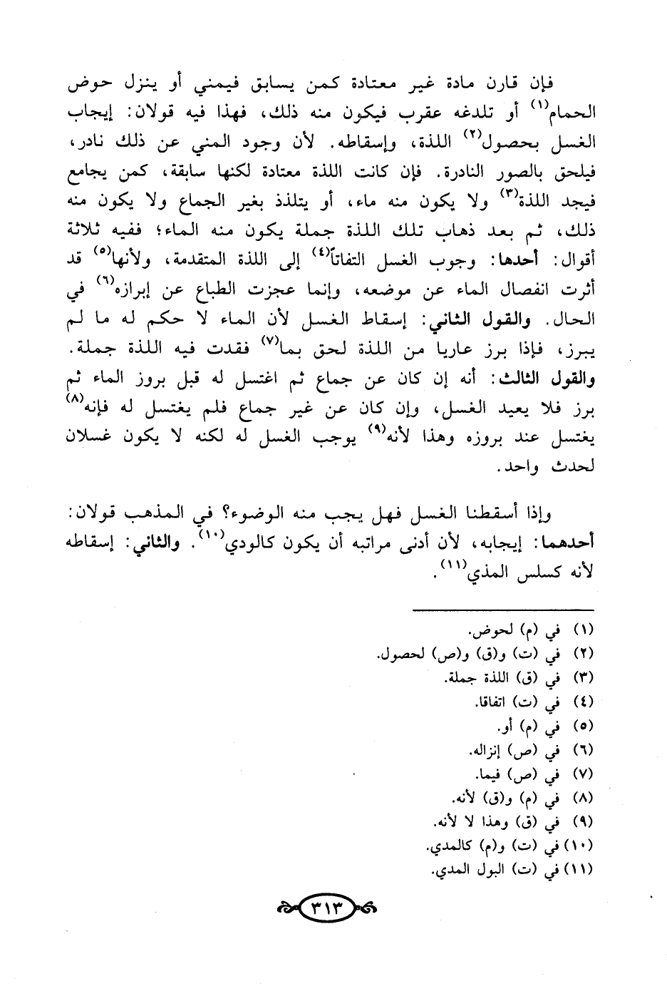 فإن قارن مادة غير معتادة كمن يسابق فيمني أو ينزل حوض الحمام (¬1) أو تلدغه عقرب فيكون منه ذلك، فهذا فيه قولان: إيجاب الغسل بحصول (¬2) اللذة، وإسقاطه. لأن وجود المني عن ذلك نادر، فيلحق بالصور النادرة. فإن كانت اللذة معتادة لكنها سابقة، كمن يجامع فيجد اللذة (¬3) ولا يكون منه ماء، أو يتلذذ بغير الجماع ولا يكون منه ذلك، ثم بعد ذهاب تلك اللذة جملة يكون منه الماء؛ ففيه ثلاثة أقوال: أحدها: وجوب الغسل التفاتاً (¬4) إلى اللذة المتقدمة، ولأنها (¬5) قد أثرت انفصال الماء عن موضعه، وإنما عجزت الطباع عن إبرازه (¬6) في الحال. والقول الثاني: إسقاط الغسل لأن الماء لا حكم له ما لم يبرز، فإذا برز عاريا من اللذة لحق بما (¬7) فقدت فيه اللذة جملة. والقول الثالث: أنه إن كان عن جماع ثم اغتسل له قبل بروز الماء ثم برز فلا يعيد الغسل، وإن كان عن غير جماع فلم يغتسل له فإنه (¬8) يغتسل عند بروزه وهذا لأنه (¬9) يوجب الغسل له لكنه لا يكون غسلان لحدث واحد.