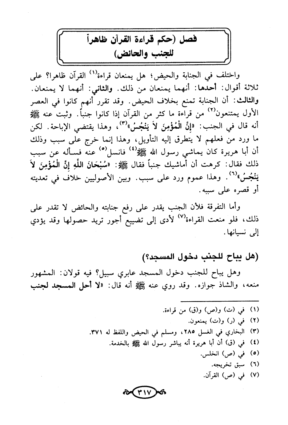 وهل يباح للجنب دخول المسجد عابري سبيل؟ فيه قولان: المشهور منعه، والشاذ جوازه. وقد روي عنه - صلى الله عليه وسلم - أنه قال: "لا أحل المسجد لجنب