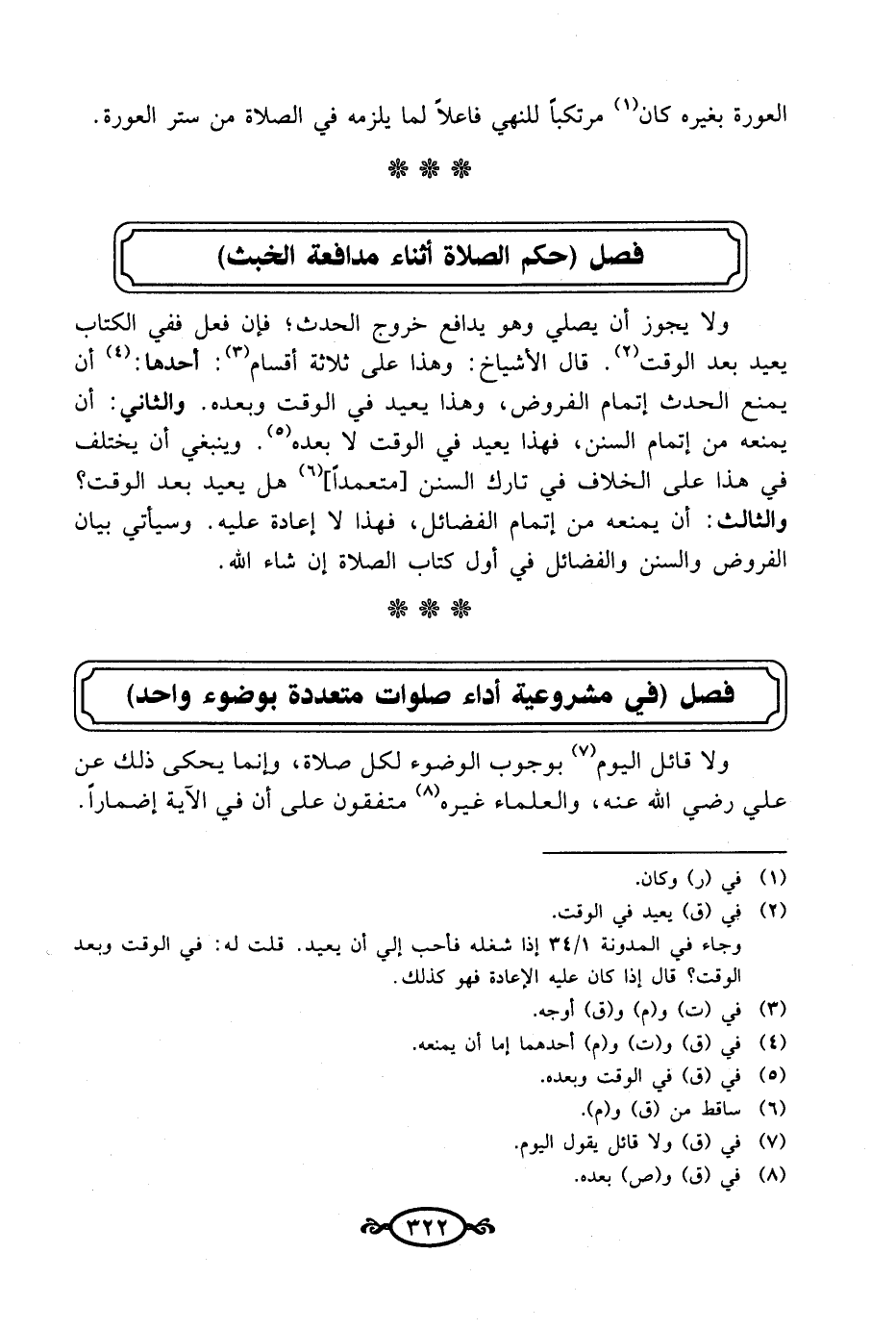 ولا يجوز أن يصلي وهو يدافع خروج الحدث؛ فإن فعل ففي الكتاب يعيد بعد الوقت (¬2). قال الأشياخ: وهذا على ثلاثة أقسام (¬3): أحدها: (¬4) أن يمنع الحدث إتمام الفروض، وهذا يعيد في الوقت وبعده. والثاني: أن يمنعه من إتمام السنن، فهذا يعيد في الوقت لا بعده (¬5). وينبغي أن يختلف في هذا على الخلاف في تارك السنن [متعمداً] (¬6) هل يعيد بعد الوقت؟ والثالث: أن يمنعه من إتمام الفضائل، فهذا لا إعادة عليه. وسيأتي بيان الفروض والسنن والفضائل في أول كتاب الصلاة إن شاء الله.