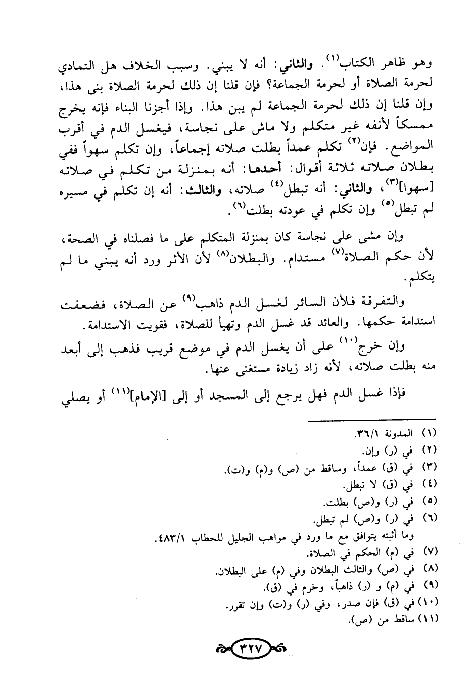 وهو ظاهر الكتاب (¬1). والثاني: أنه لا يبني. وسبب الخلاف هل التمادي لحرمة الصلاة أو لحرمة الجماعة؟ فإن قلنا إن ذلك لحرمة الصلاة بني هذا، وإن قلنا إن ذلك لحرمة الجماعة لم يبن هذا. وإذا أجزنا البناء فإنه يخرج ممسكاً لأنفه غير متكلم ولا ماش على نجاسة، فيغسل الدم في أقرب المواضع. فإن (¬2) تكلم عمداً بطلت صلاته إجماعاً، وإن تكلم سهواً ففي بطلان صلاته ثلاثة أقوال: أحدها: أنه بمنزلة من تكلم في صلاته [سهوا] (¬3)، والثاني: أنه تبطل (¬4) صلاته، والثالث: أنه إن تكلم في مسيره لم تبطل (¬5) وإن تكلم في عودته بطلت (¬6).