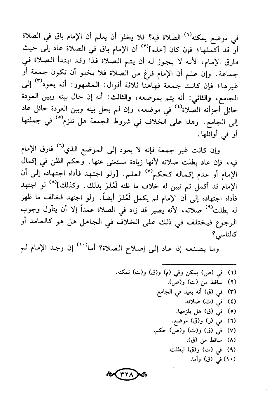 في موضع يمكنه (¬1) الصلاة فيه؟ فلا يخلو أن يعلم أن الإمام باق في الصلاة أو قد أكملها؛ فإن كان [علم] (¬2) أن الإمام باق في الصلاة عاد إلى حيث فارق الإمام، لأنه لا يجوز له أن يتم الصلاة فذا وقد ابتدأ الصلاة في جماعة. وإن علم أن الإمام فرغ من الصلاة فلا يخلو أن تكون جمعة أو غيرها؛ فإن كانت جمعة فهاهنا ثلاثة أقوال: المشهور: أنه يعود (¬3) إلى الجامع، والثاني: أنه يتم بموضعه، والثالث: أنه إن حال بينه وبين العودة حائل أجزأته الصلاة (¬4) في موضعه، وإن لم يحل بينه وبين العودة حائل عاد إلى الجامع. وهذا على الخلاف في شروط الجمعة هل تلزم (¬5) في جملتها أو في أوائلها.