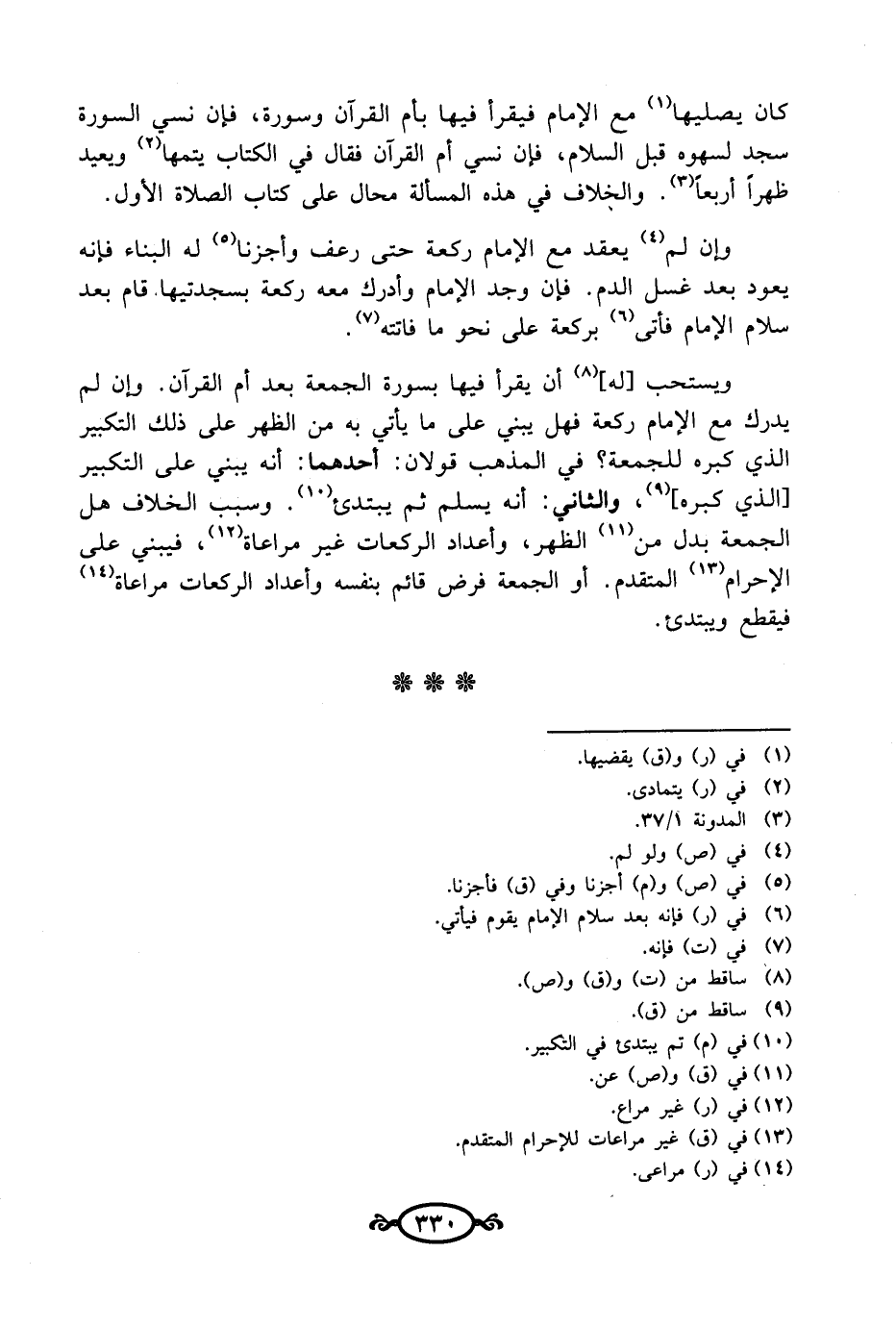 ويستحب [له] (¬8) أن يقرأ فيها بسورة الجمعة بعد أم القرآن. وإن لم يدرك مع الإمام ركعة فهل يبني على ما يأتي به من الظهر على ذلك التكبير الذي كبره للجمعة؟ في المذهب قولان: أحدهما: أنه يبني على التكبير [الذي كبره] (¬9)، والثاني: أنه يسلم ثم يبتدئ (¬10). وسبب الخلاف هل الجمعة بدل من (¬11) الظهر، وأعداد الركعات غير مراعاة (¬12)، فيبني على الإحرام (¬13) المتقدم. أو الجمعة فرض قائم بنفسه وأعداد الركعات مراعاة (¬14) فيقطع ويبتدئ.