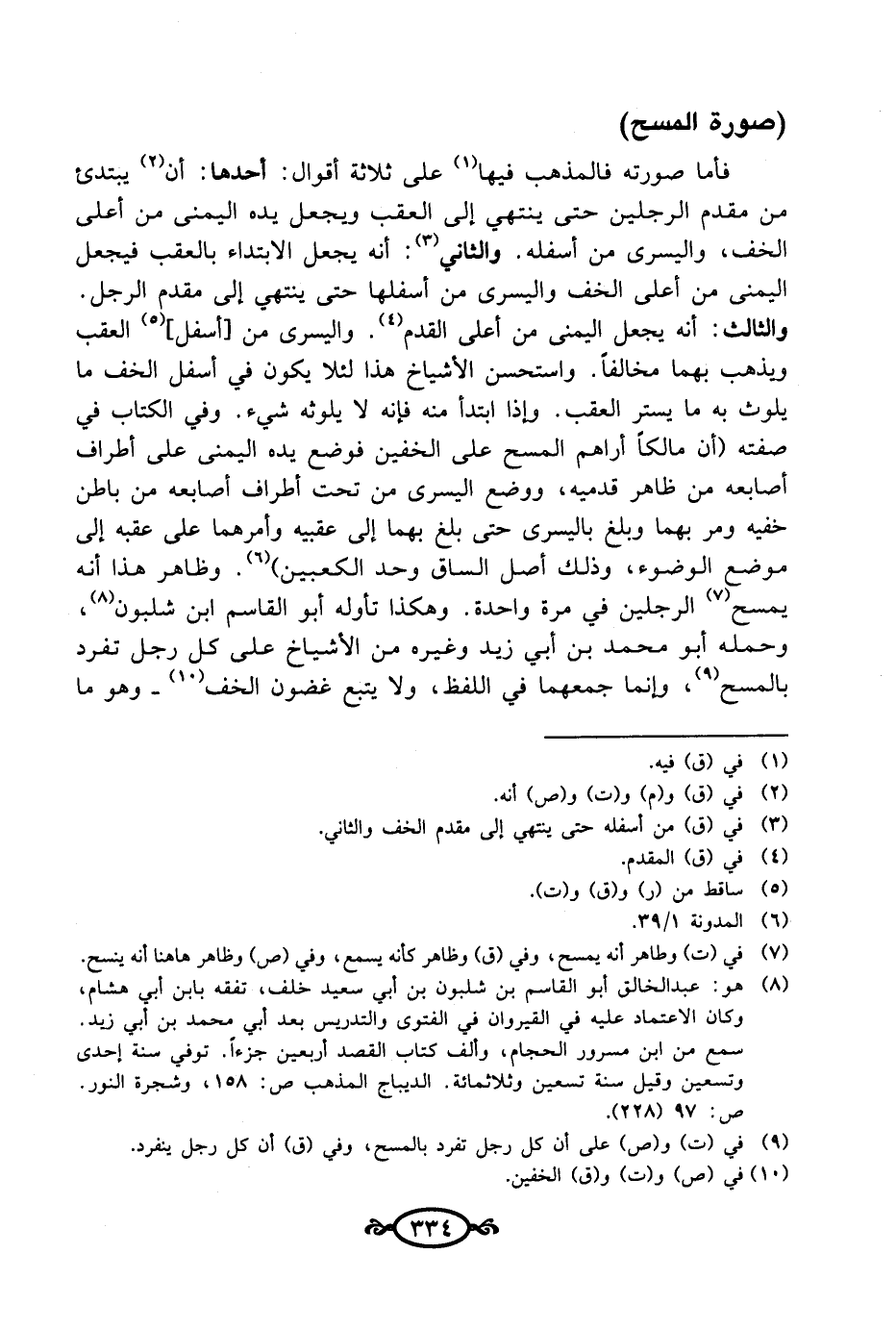 فأما صورته فالمذهب فيها (¬1) على ثلاثة أقوال: أحدهما: أن (¬2) يبتدئ من مقدم الرجلين حتى ينتهي إلى العقب ويجعل يده اليمنى من أعلى الخف، واليسرى من أسفله. والثاني (¬3): أنه يجعل الابتداء بالعقب فيجعل اليمنى من أعلى الخف واليسرى من أسفلها حتى ينتهي إلى مقدم الرجل. والثالث: أنه يجعل اليمنى من أعلى القدم (¬4). واليسرى من [أسفل] (¬5) العقب ويذهب بهما مخالفاً. واستحسن الأشياخ هذا لئلا يكون في أسفل الخف ما يلوث به ما يستر العقب. وإذا ابتدأ منه فإنه لا يلوثه شيء. وفي الكتاب في صفته (أن مالكاً أراهم المسح على الخفين فوضع يده اليمنى على أطراف أصابعه من ظاهر قدميه، ووضع اليسرى من تحت أطراف أصابعه من باطن خفيه ومر بهما وبلغ باليسرى حتى بلغ بهما إلى عقبيه وأمرهما على عقبه إلى موضع الوضوء، وذلك أصل الساق وحد الكعبين) (¬6). وظاهر هذا أنه يمسح (¬7) الرجلين في مرة واحدة. وهكذا تأوله أبو القاسم ابن شلبون (¬8)، وحمله أبو محمد بن أبي زيد وغيره من الأشياخ على كل رجل تفرد بالمسح (¬9)، وإنما جمعهما في اللفظ، ولا يتبع غضون الخف (¬10) -وهو ما
