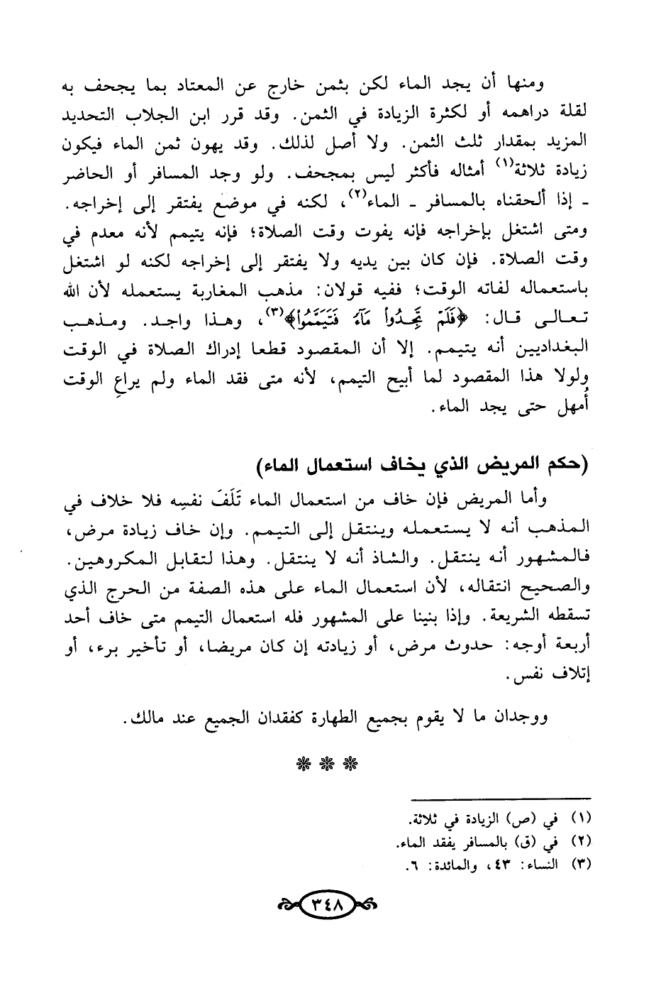 ومنها أن يجد الماء لكن بثمن خارج عن المعتاد بما يجحف به لقلة دراهمه أو لكثرة الزيادة في الثمن. وقد قرر ابن الجلاب التحديد المزيد بمقدار ثلث الثمن. ولا أصل لذلك. وقد يهون ثمن الماء فيكون زيادة ثلاثة (¬1) أمثاله فأكثر ليس بمجحف. ولو وجد المسافر أو الحاضر - إذا ألحقناه بالمسافر- الماء (¬2)، لكنه في موضع يفتقر إلى إخراجه. ومتى اشتغل بإخراجه فإنه يفوت وقت الصلاة؛ فإنه يتيمم لأنه معدم في وقت الصلاة. فإن كان بين يديه ولا يفتقر إلى إخراجه لكنه لو اشتغل باستعماله لفاته الوقت؛ ففيه قولان: مذهب المغاربة يستعمله لأن الله تعالى قال: {فَلَمْ تَجِدُوا مَاءً فَتَيَمَّمُوا} (¬3)، وهذا واجد. ومذهب البغداديين أنه يتيمم. إلا أن المقصود قطعا إدراك الصلاة في الوقت ولولا هذا المقصود لما أبيح التيمم، لأنه متى فقد الماء ولم يراعِ الوقت أُمهل حتى يجد الماء.