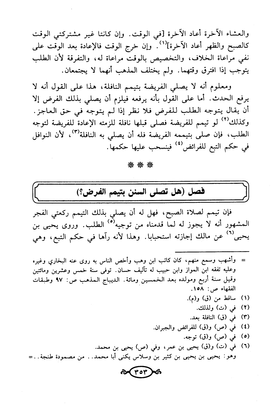 فإن تيمم لصلاة الصبح، فهل له أن يصلي بذلك التيمم ركعتي الفجر المشهور أنه لا يجوز له لما قدمناه من توجيه (¬5) الطلب. وروى يحيى بن يحيى (¬6) عن مالك إجازته استحبابا. وهذا لأنه رآها في حكم التبع، وهي